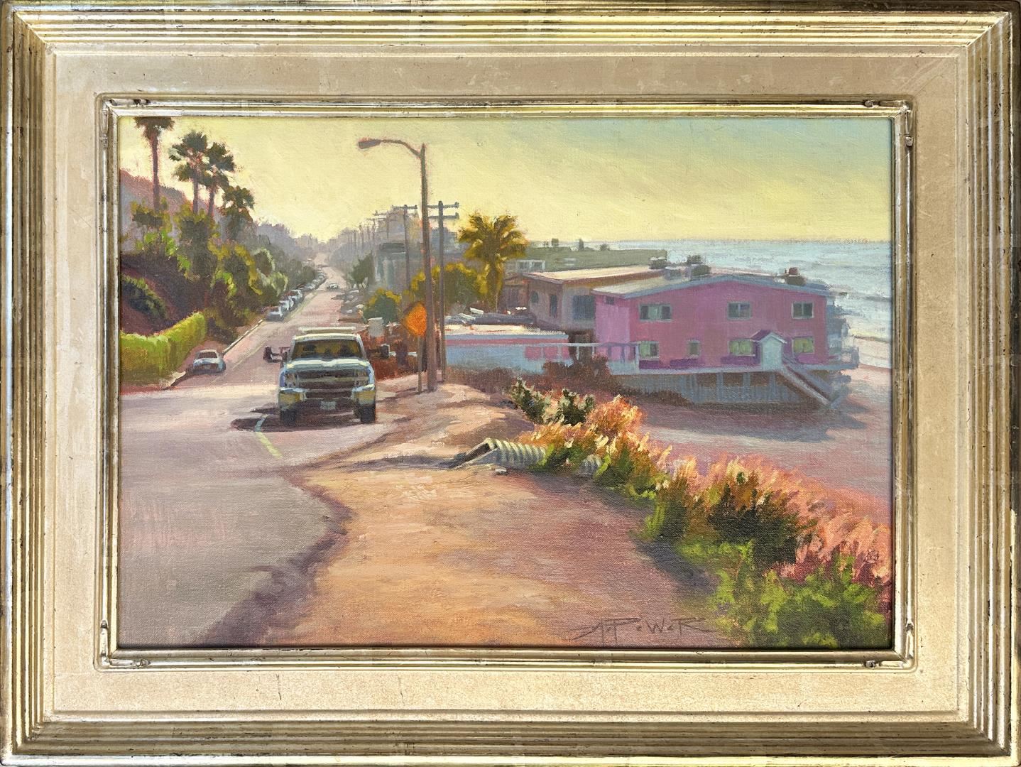 This 14x20 oil painting of charming Malibu Road by Anette Power was exhibited at Pepperdine Art Museum. It is a canvaspanel, framed at 19x25, with artist's COA