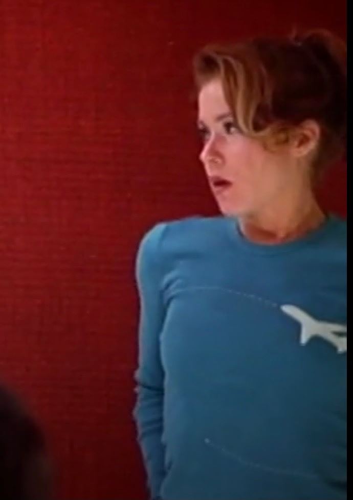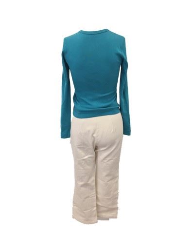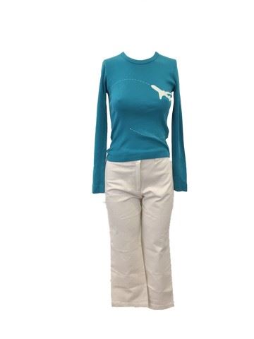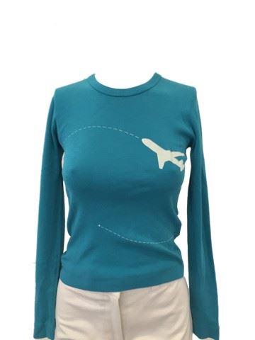 View From The Top (2003) - Christine's (Christina Applegate) screen worn, teal, long sleeve cotton crew neck shirt. Shirt features an airplane with dotted lines showing the route (size small). Comes with a pair of white zip fly, custom made, cotton pants from "The Costume Collection". Originally sold by Premiere Props from the Miramax Archives auction.