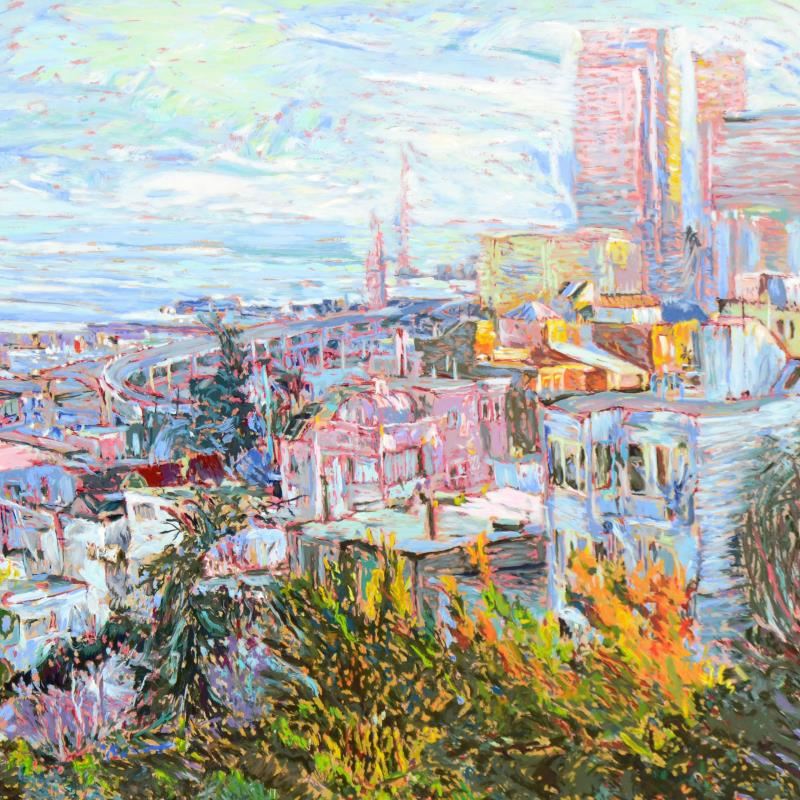 "View at Bay Bridge" is a limited edition serigraph on paper by Marco Sassone, numbered and hand signed by the artist. Includes Letter of Authenticity. Measures approx. 44.5" x 36" (border), 40" x 32" (image).