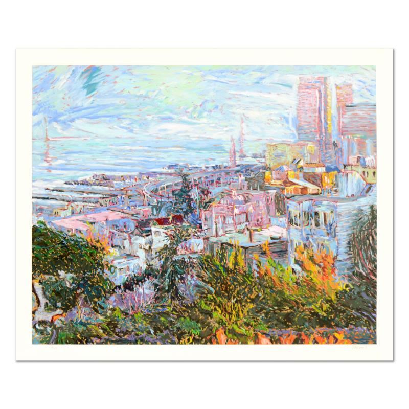 "View at Bay Bridge" is a limited edition serigraph on paper by Marco Sassone, numbered and hand signed by the artist. Includes Letter of Authenticity. Measures approx. 44.5" x 36" (border), 40" x 32" (image).