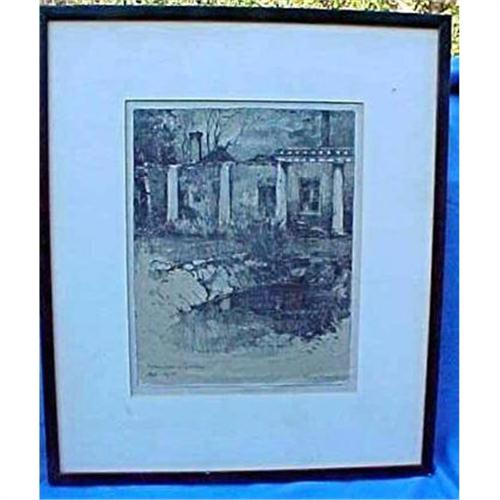Lithograph by Luigi Kasimir titled A view from the Garden. Dated 1915 and signed in plate lower right. Fully framed. Image size 8 3/4 X 6 3/4 inches. Frame size 15 X 12 3/4 inches