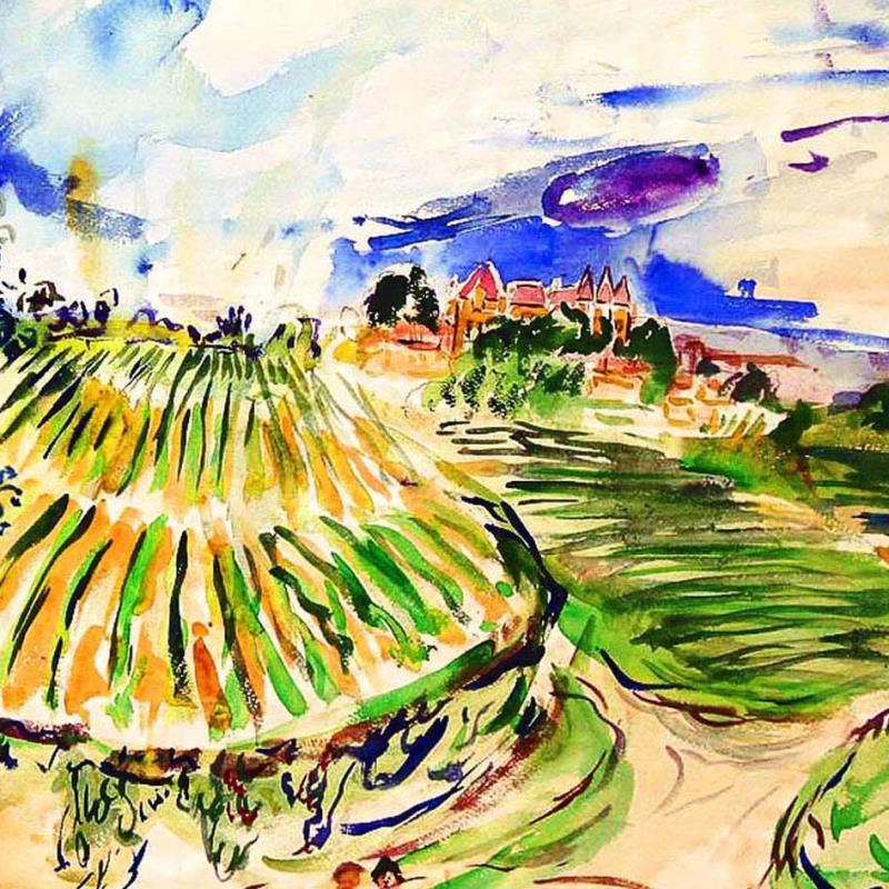 "View of Chateau Haut-Brion Vineyards" is an original Mixed Media on Paper by Wayne Ensrud. The piece is hand signed by the artist and comes with a Certificate of Authenticity. Measures approximately 20" x 27".