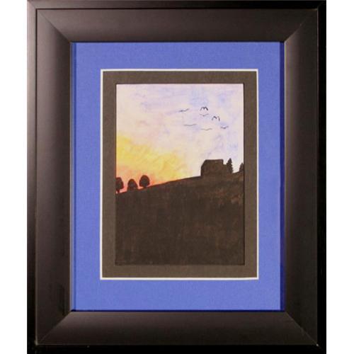 Margaret Neill?s original watercolor entitled, ?View of Hill & House? is a charming illustration of a hilltop home at sunset. The landscape has been painted in total silhouette with a few trees dotting the horizon along with a quaint house or cabin. A flock of birds is also silhouetted against the glowing sky. In stark contrast to the inky black silhouettes, the vibrant orange of the sun radiating gold and yellow as it sinks below the horizon is the true focal point of the piece. The painting has been double matted in a deep black bottom mat which extends the silhouettes beyond the picture plane, and a royal blue top mat which compliments the soft blue of the sky. The piece has been mounted in a black wood frame providing another layer of contrast and bringing the total measurements to 10 5/8? x 12 5/8.? The artist signed and dated the work on the back and it reads, ?Margaret L. Neill, Dec. 1 1936, No. 18.? This lovely piece would be an affordable addition to any collection of watercolor paintings and add instant drama to any space.