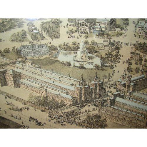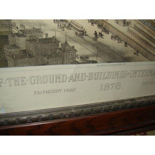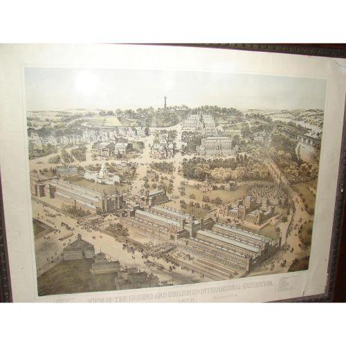 "The View of The Grounds & Buildings of the International Exposition" by A.L:. Weise. Color lithograph dated 1876. Measures image size 27x22 with frame 34x29. Some damage in the bottom lower left corner ( not into the color image)