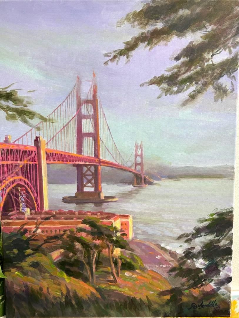 A charming view of the Golden Gate Bridge from the SF side. This is 24x18" original acrylic on stretched canvas by Richard Ho, with COA