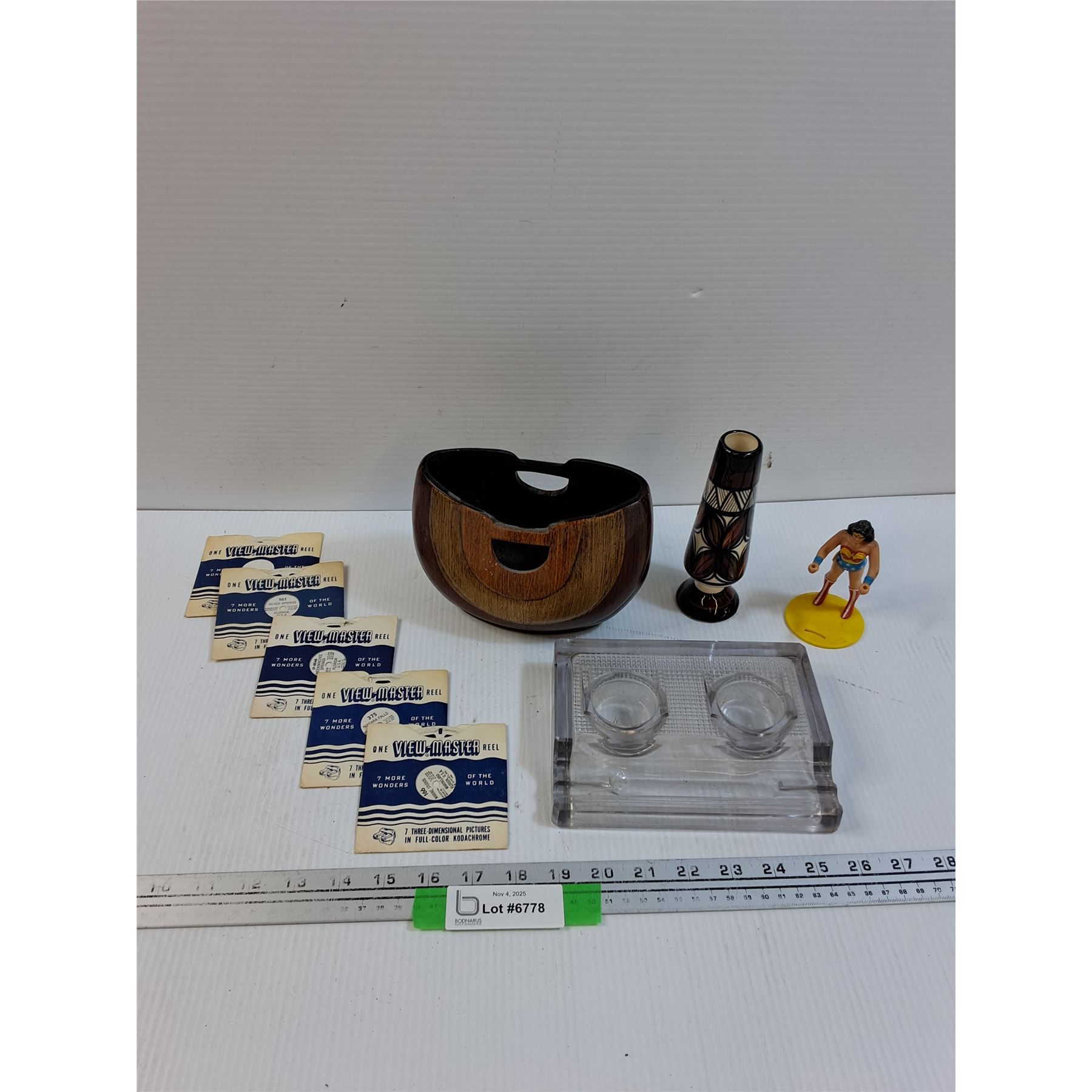 Viewmaster Slides, Wooden Vase, Ceramic Vase, Glass Ink Well, Wonder Woman