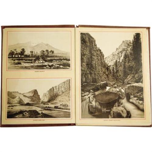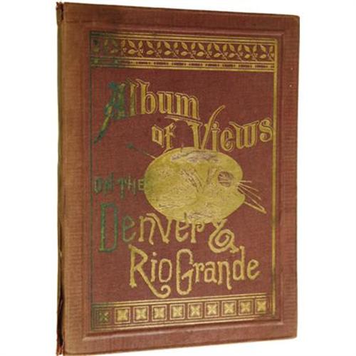 <B> VIEWBOOK . Album of Views on the Denver & Rio Grande.</B></I> ( Denver, Colorado: W.H. Lawrence Co., 1886 ). Fourteen fold-out photographic panels with twenty-one views, including: Garden of the Gods and Pike's Peak, Manitou, Williams Canon near Manitou, Veta Pass, Sierra Blanca, Wagon Wheel Gap, Toltec Gorge and tunnel, Phantom Curve, Silverton and Sultan Mountain, Royal Gorge, Upper Twin Lake, Fremont Pass, Mount of the Holy Cross, Marshall Pass (eastern and western slopes), Currecanti Needle in the Black Canon of the Gunnison, Chipeta Falls, Castle Gate in Price Canon, Gunnison Butte on the Green River, and the Great Salt Lake. Small quarto (7.5” x 5.5”). Original boards of reddish-brown cloth, lettered and decorated in gilt. Faded, rubbed and worn, with some splitting along the spine and joints. Internally some of the folds are separated so that the contents are loose in the binding. A fair copy of a scarce viewbook.<BR><BR><b>Shipping:</b> Books & Catalogs (<a target="_blank" href="http://www.heritageauctions.com/common/shipping.php">view shipping information</a>)