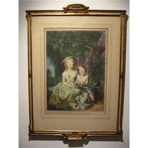 a beautiful portrait of Elizabeth Louis Vigee Le Braun w antique french frame. printed by Braun & Co. lower right side and Vigee le brun pinx on the left side. print is in good condition with imperfections. beautiful antique frame is gilded and decorated with beautiful pattern. mat is in ok condition. very collectible. my study shows that this print is from France. 31 inch ht.x22"widthx1" .