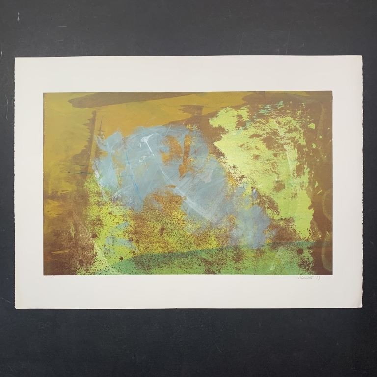 An original print by Viglione, signed and dated lower right. An abstract piece, done in blue, green, yellow and brown. This piece is in near excellent condition with a extremely small and minor wrinkles in lower right and lower left corners.