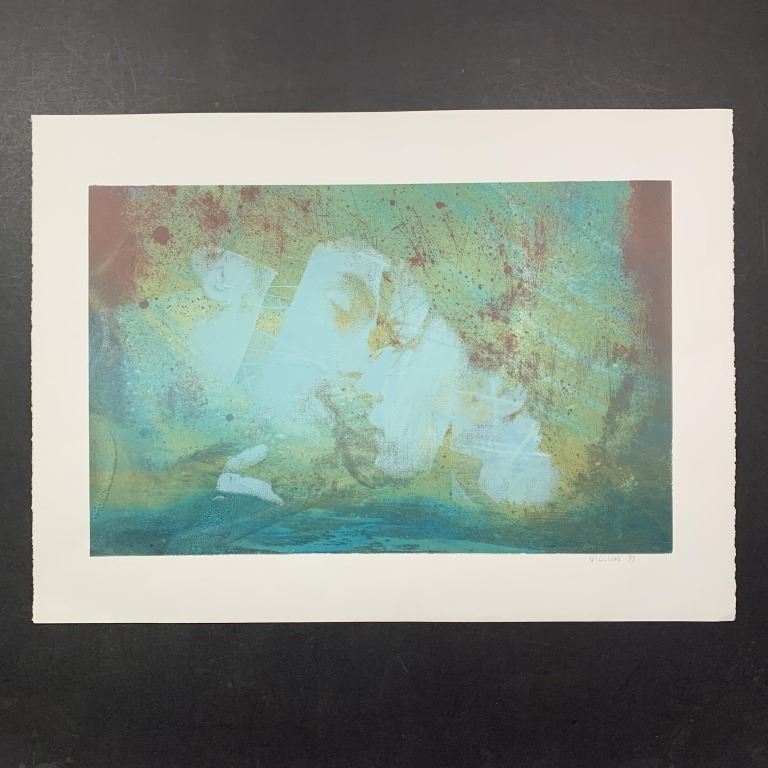 An original print by Viglione, signed and dated lower right. An abstract piece in blues and red, accented by some yellow. This piece is in near excellent with an extremely minor, very small crease lower right corner.