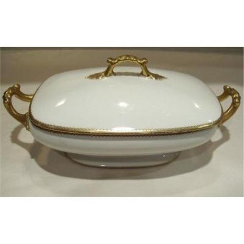 We have a covered serving dish with a gold border by Vignaud, Limoges France. This piece was imported for the famous Wanamaker's Department Store, and dates to the 1930's - 1940's. The dish is a bright white porcelain with a gold scalloped border outlined in black with gold handles. The dish measures 10" long by 7" wide and is 2 1/2" deep. This is marked with the green Vignaud stamp as well as the Wanamaker's green stamp with the "W" inside of a green wreath, and Philadelphia, Paris, New York below. The covered dish is in very good condition with no chips or cracks on the base or lid. The gold handles do show some wear from age as expected. Very nice piece!