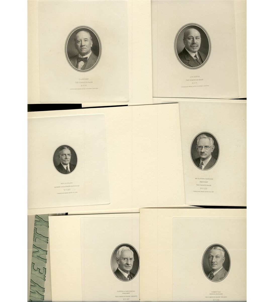 Vignette Lot; includes different Portraits of members of La Banque Canadienne Nationale, Beaudry Leman, J.M. Wilson & F.L. Beique, The Dominion Bank, Robert Rae, C.H. Carlisle(2), Dudley Dawson, Bogart & Austin along with two partial Bank of New Brunswick rev proofs. Both on stock type paper as well.