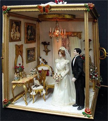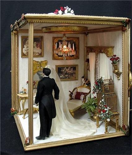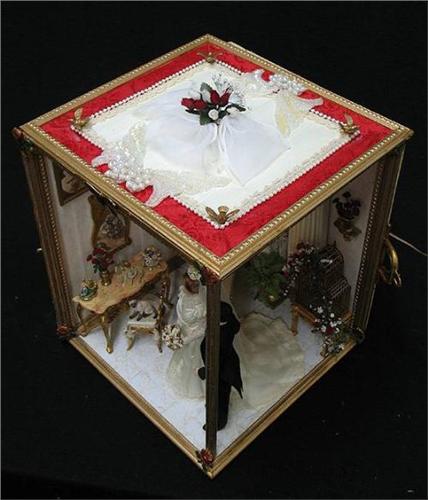 Vignette "the Wedding Album" depicting bride and groom in interior; electrified with lighted chandelier; created by Phyllis Sturbakov; in Plexiglas case; with first place ribbon; late 20th C. 13 1/2" high x 12" x 10" (no visible defects) Will Not Ship