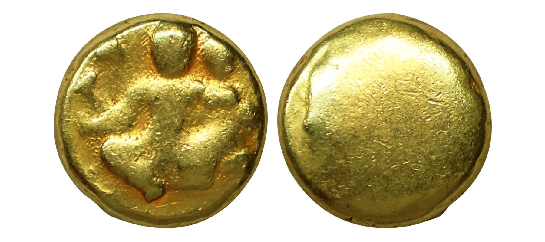 Vijayanagar, Devaraya I/II, Gold Varaha, 3.38 gms, Obv. Seated Shiva and Parvati, Shiva’s top right hand holds a Damaru, bottom right in abhayamudra, top left hand holds a Trishul and bottom left around Parvati’s waist, Rev. blank, fine, very scarce.