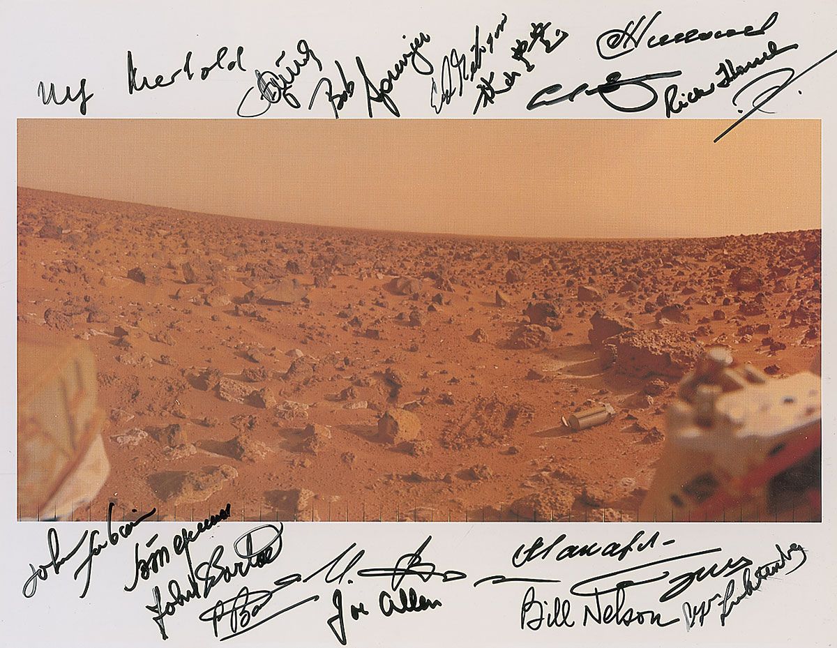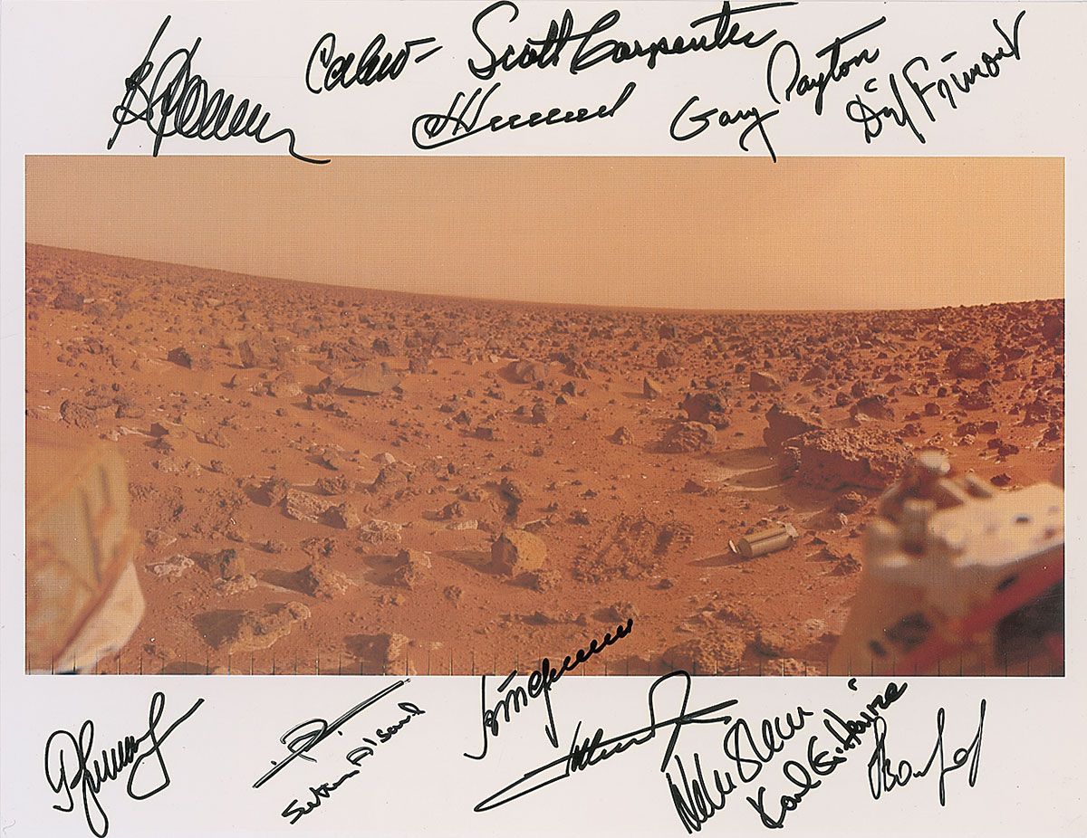 Two identical color glossy 10 x 8 panoramic photos of the Martian landscape taken by Viking 2. One photo is signed in black felt tip by Scott Carpenter, Alexander Volkov, Karl Heinze, Helen Sharman, Alexander Alexandrov, Valentina Tereshkova, Sultan Al-Saud, Nikolai Rukavishnikov, Valery Ryumin, Svetlana Savitskaya, Andrian Nikolayev, Gary Payton and one other; second photo is signed by 18 others including Scott Carpenter, Joe Allen, Valentina Tereshkova, Ed Gibson, Rick Hauck, Sultan Al-Saud, Toyohiro Akiyama, and Muhammad Faris. In fine condition, with some mild haloing to some of the signatures.