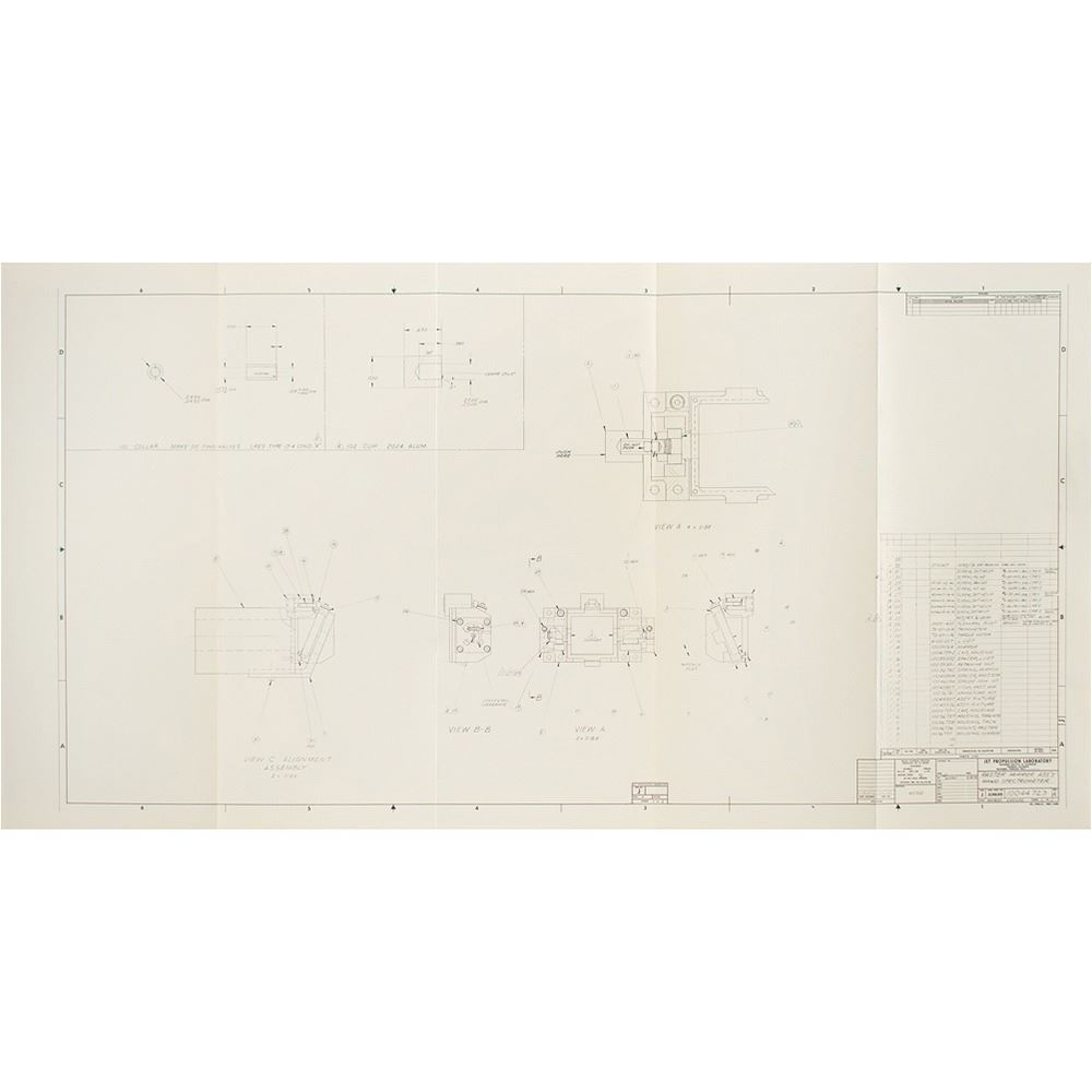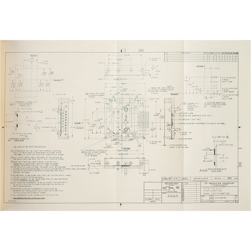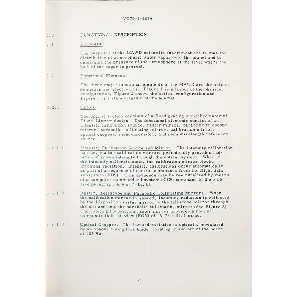 Official softcover bracket-bound report from the Jet Propulsion Laboratory entitled "Preliminary Design Review, Mars Atmospheric Water Detector Subsystem, Viking Orbiter 1975," 9 x 11, extensively documenting the Mars Atmospheric Water Detector (MAWD) instrument with summaries of its functional requirements, systems, and specifications, plus a multitude of fold-out engineering drawings and schematics of the device and its various components. In fine condition.
