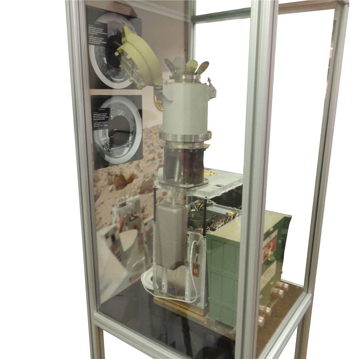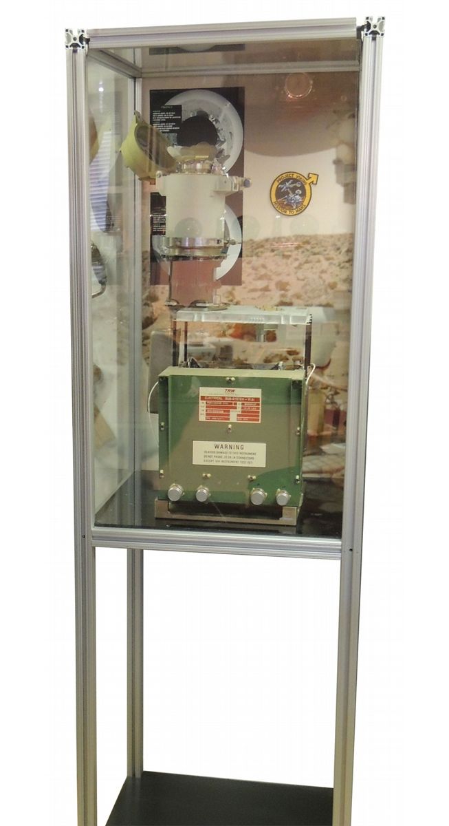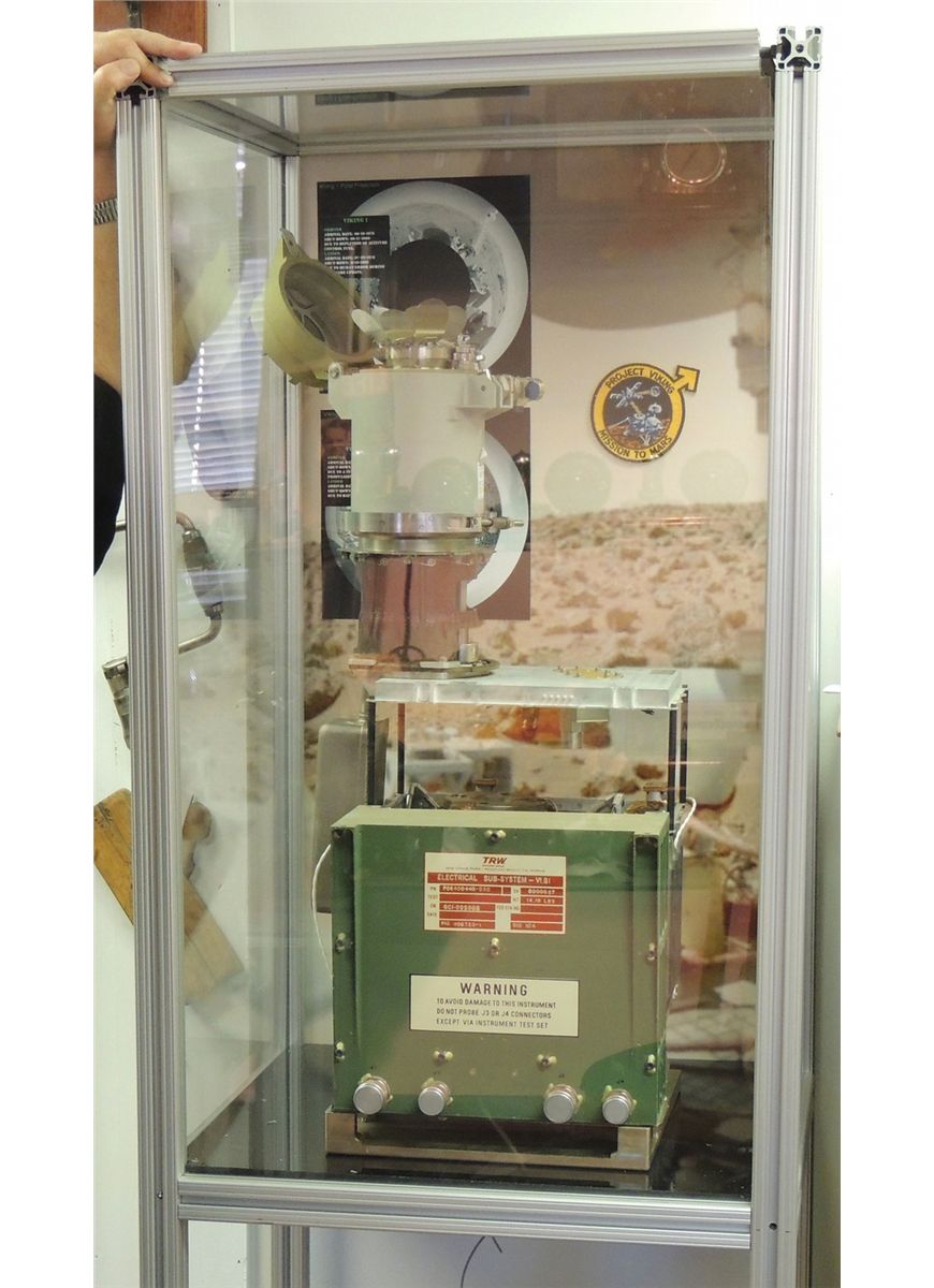 The only flight ready unit on Earth (Smithsonian’s S/N103 is incomplete and not flight ready—S/N105 and 106 are on Mars). Dimensions are: 34?H x 11?W x 14?D and weight is exactly 15.471kg. The top of the unit houses the stainless steel ‘flower’ receptacle, which would be opened via a pneumatic bolt to receive Martian soil samples deposited by the robotic scoop on the Viking lander (scoop not included). After receiving the sample, it could be heated to different temperatures and passed through a column into a lower chamber where the sample would be distributed into one of three experiments. Unit is housed in a professional 8020 aluminum frame with heavy polycarbonate clear viewing panels. All parts are present and connected as they were when this unit was readied for a Mars mission. Purchased directly from NASA Langley, the headquarters for the Viking biological research group. In fine, never used, condition. Extensive research material is available online.