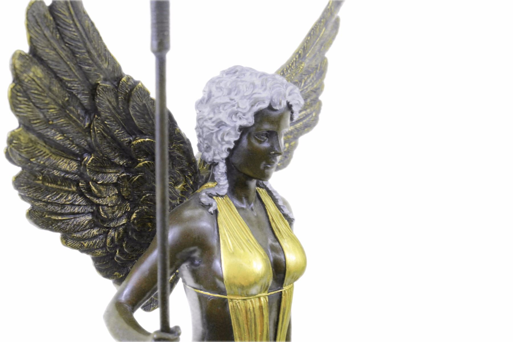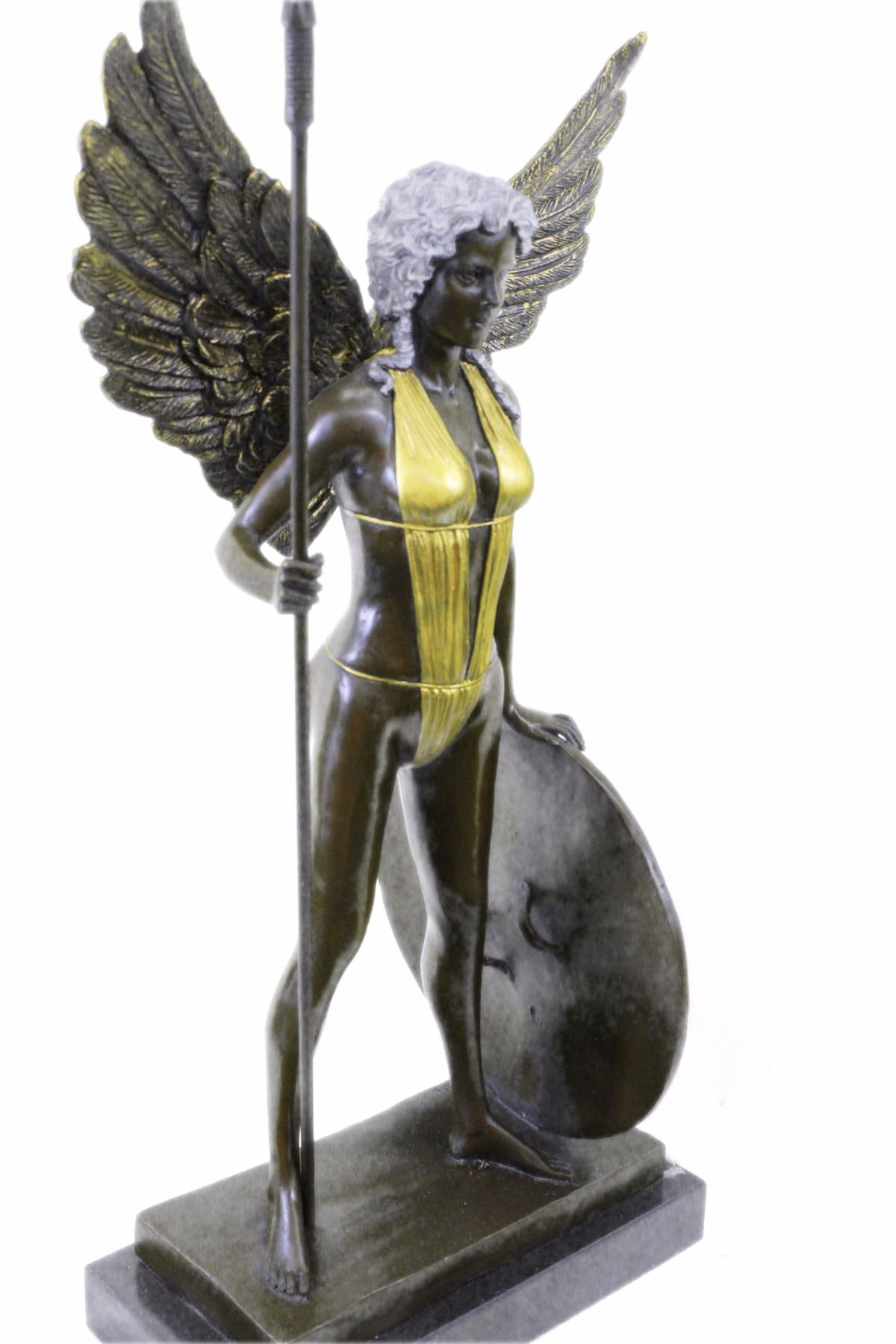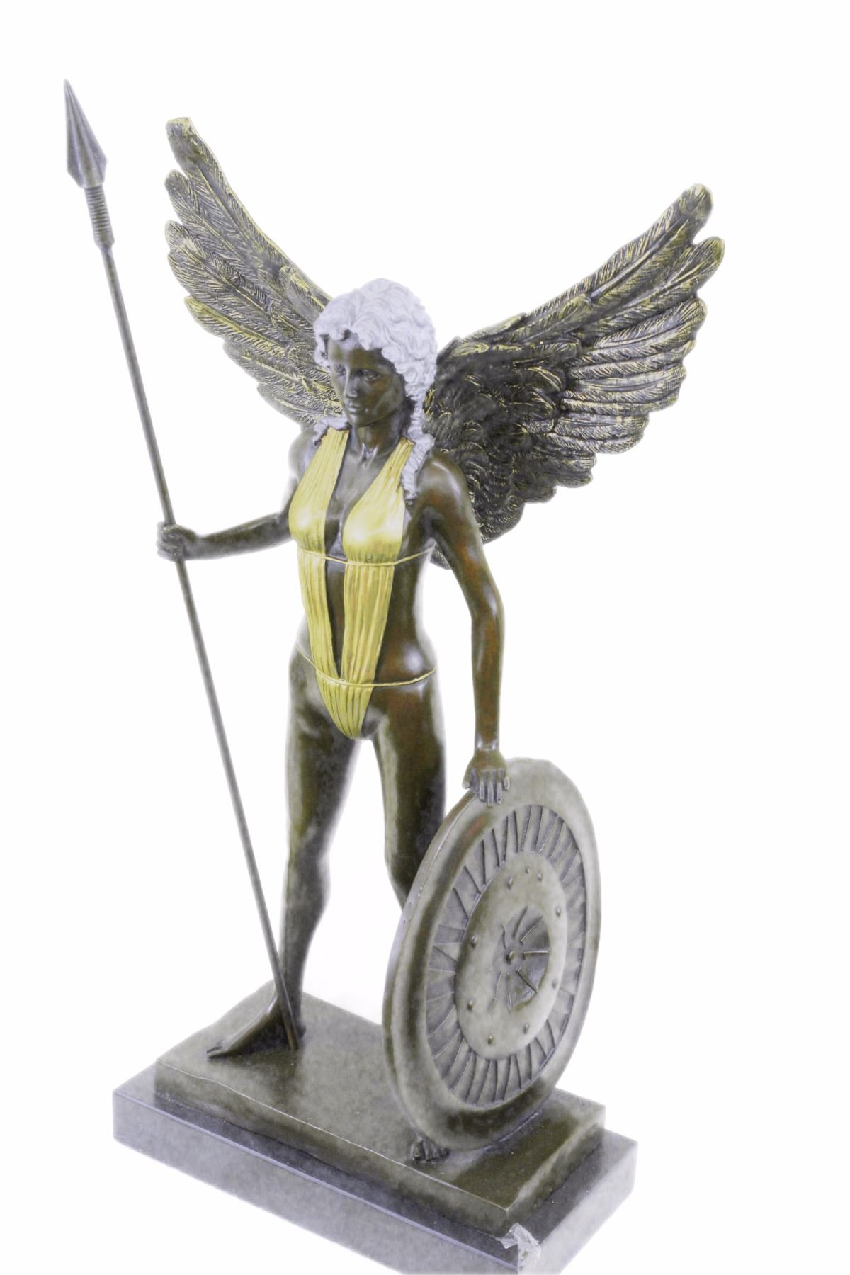 An Amazon Warrior Stands Boldly, Staring Her Enemy In The Eye. She Comes From A Supernatural World And Fights The Immortal Creatures That Ravage It. She Is Armed With A Tall Spear And Shield. Her Spear Is Planted On The Ground Beside Her, While She Rests A Hand On Her Shield. She Wears A Suit That Clings To Her Curves. Her Wings Extend Behind Her.100% Bronze And Handmade, This Brown Patina Sculpture Was Cast Using The Lost Wax Method And Mounted On A Marble Base. Bronze dimensions with marble base: Height 21 X Width 10 inches. Weight: 20 lbs.Please Note: This is a reproduction bronze sculpture from the original molded and signed. This featured bronze sculpture is a recast after the original, and has been done recently. This 100% bronze sculpture is an abstract piece certain to be a conversation piece.Please Note: This is a reproduction bronze sculpture from the original molded and signed. This featured bronze sculpture is a recast after the original, and has been done recently. This 100% bronze sculpture is an abstract piece certain to be a conversation piece.