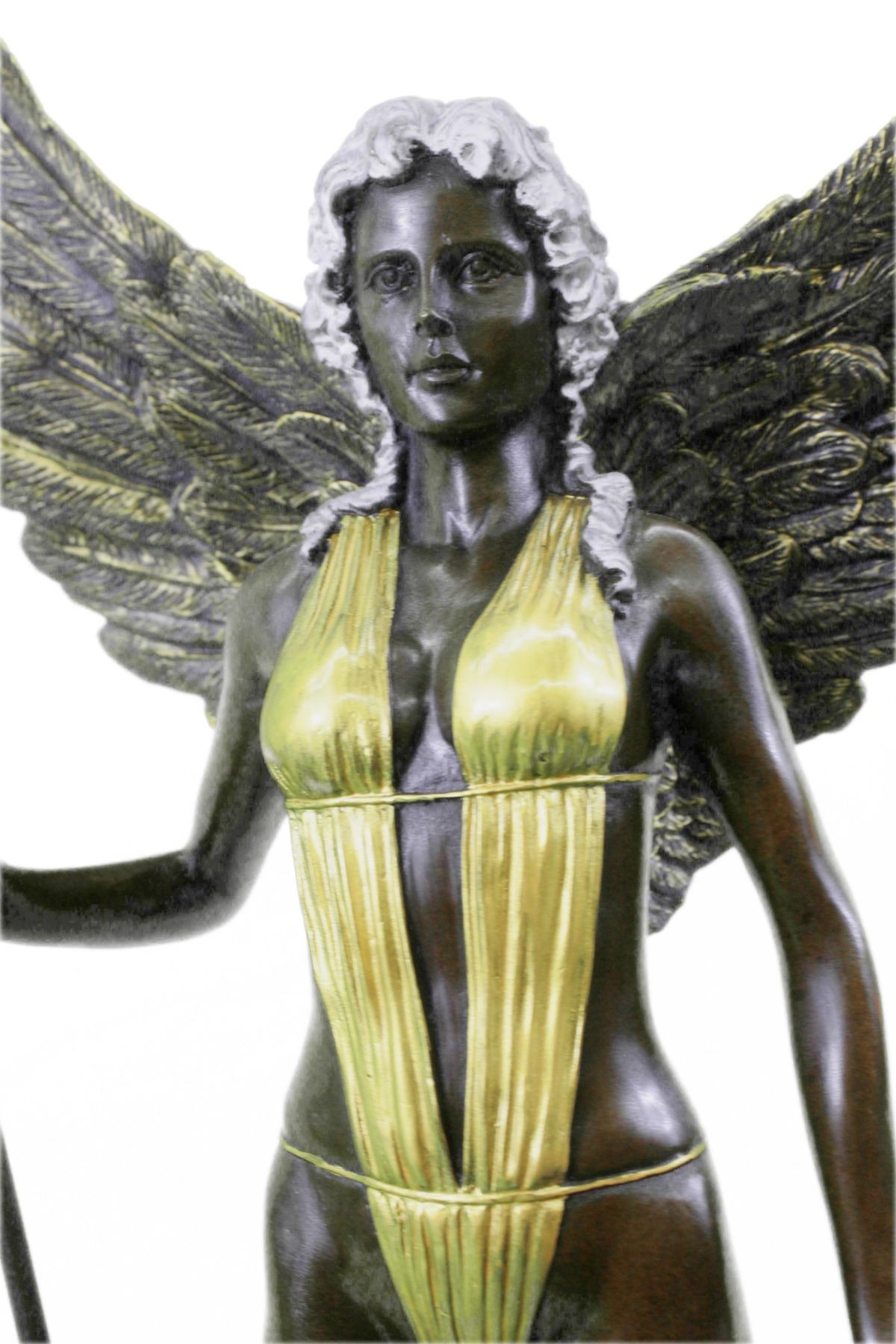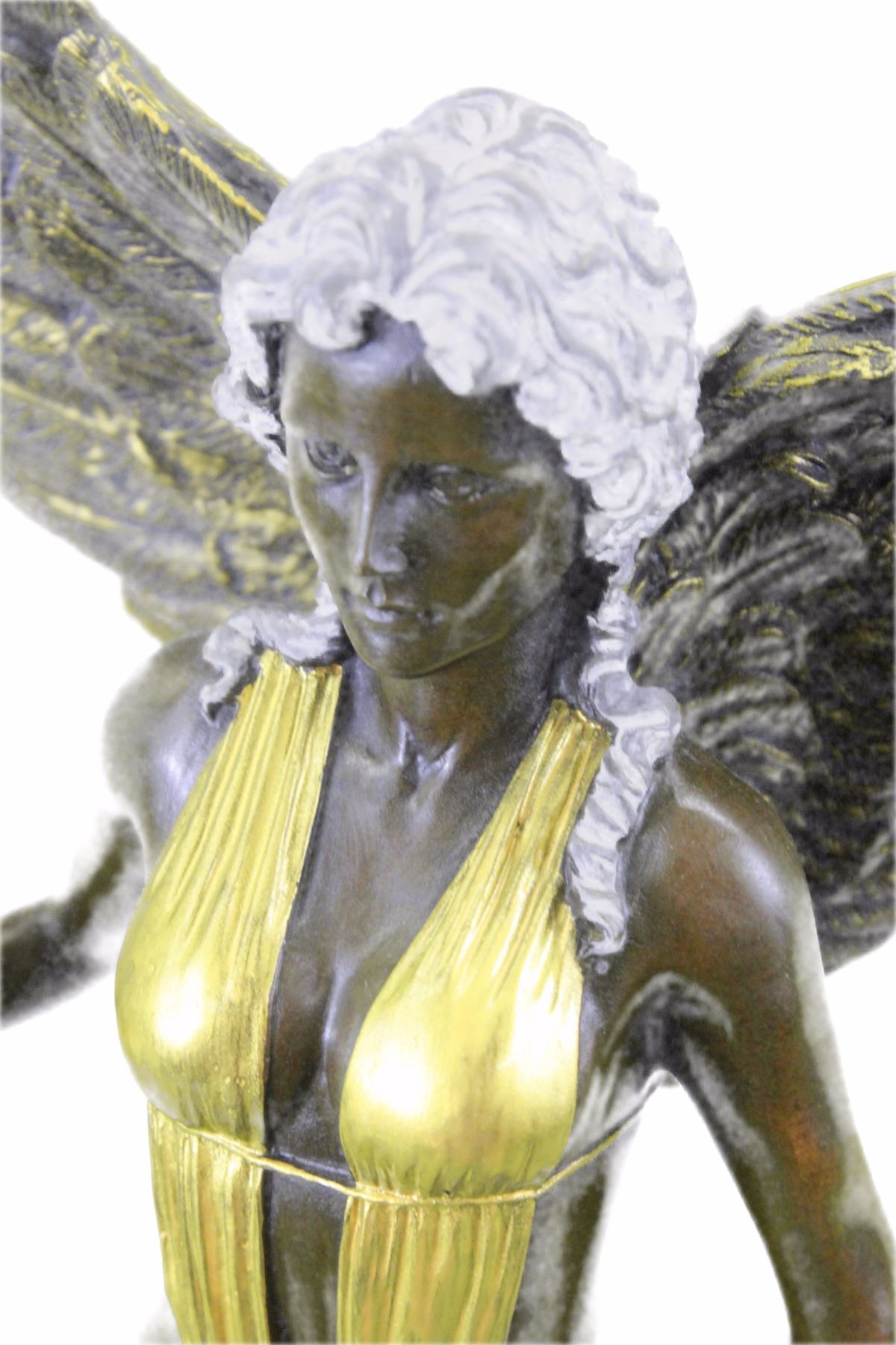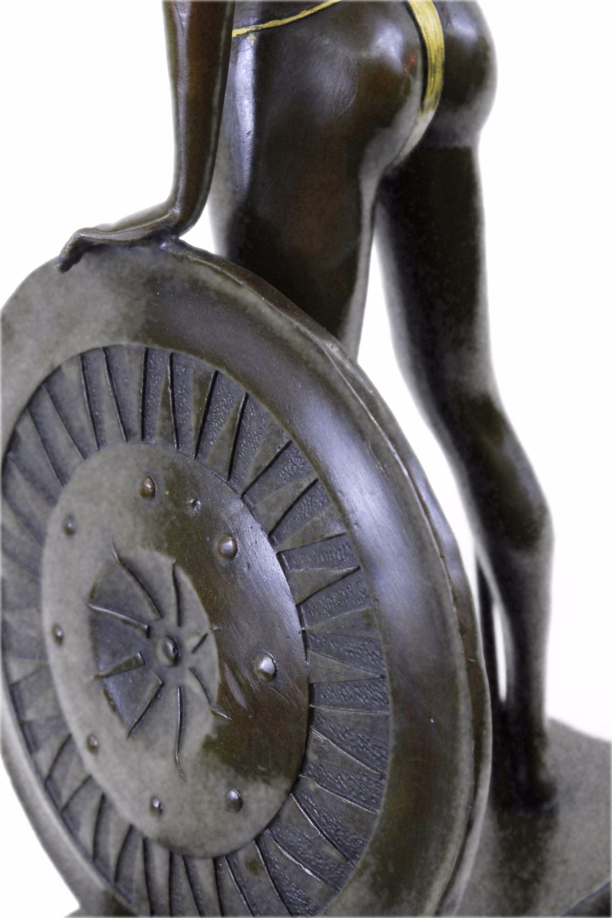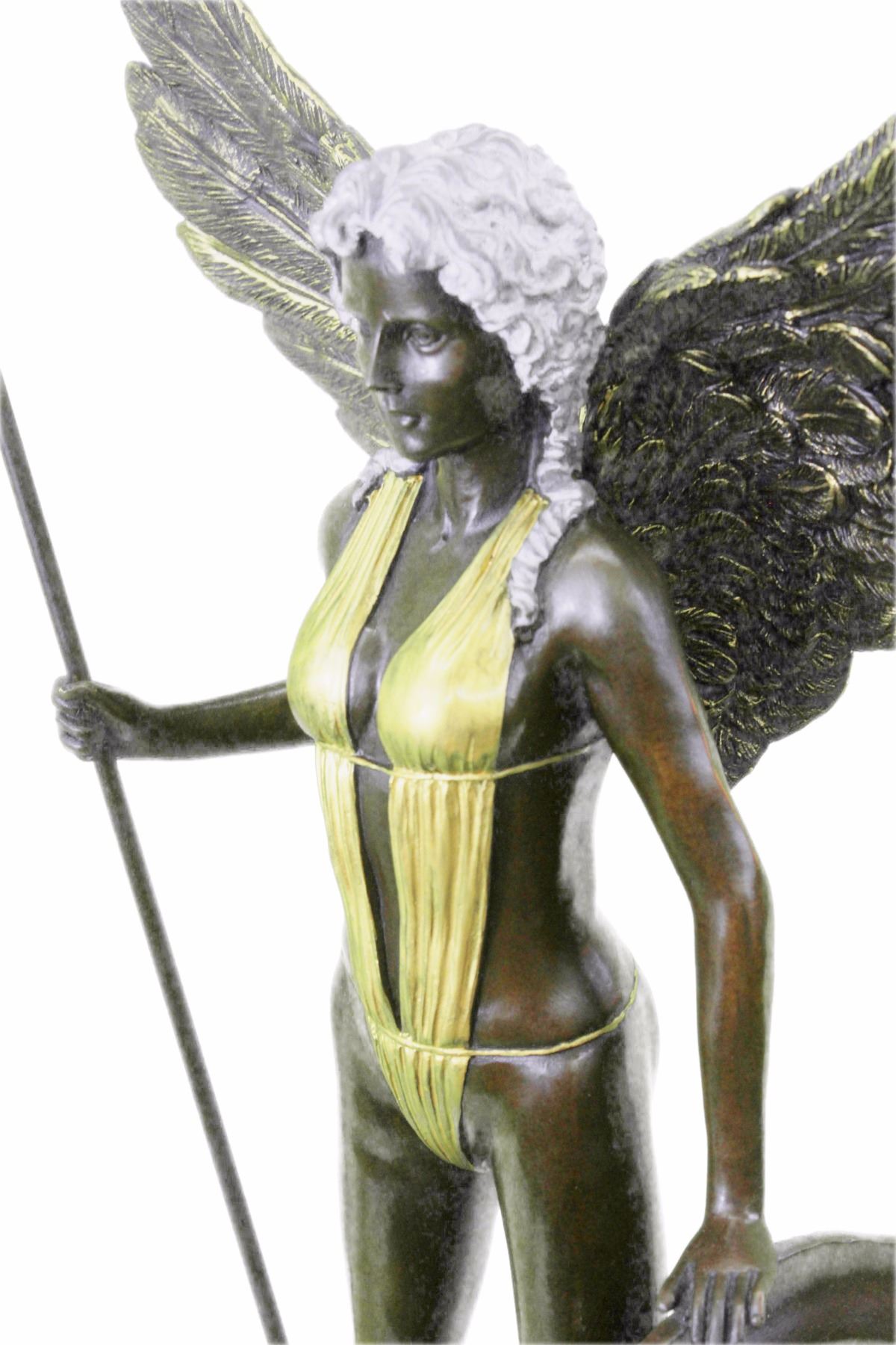 An Amazon Warrior Stands Boldly, Staring Her Enemy In The Eye. She Comes From A Supernatural World And Fights The Immortal Creatures That Ravage It. She Is Armed With A Tall Spear And Shield. Her Spear Is Planted On The Ground Beside Her, While She Rests A Hand On Her Shield. She Wears A Suit That Clings To Her Curves. Her Wings Extend Behind Her.100% Bronze And Handmade, This Brown Patina Sculpture Was Cast Using The Lost Wax Method And Mounted On A Marble Base. Bronze dimensions with marble base: Height 21 X Width 10 inches. Weight: 20 lbs.Please Note: This is a reproduction bronze sculpture from the original molded and signed. This featured bronze sculpture is a recast after the original, and has been done recently. This 100% bronze sculpture is an abstract piece certain to be a conversation piece.Please Note: This is a reproduction bronze sculpture from the original molded and signed. This featured bronze sculpture is a recast after the original, and has been done recently. This 100% bronze sculpture is an abstract piece certain to be a conversation piece.