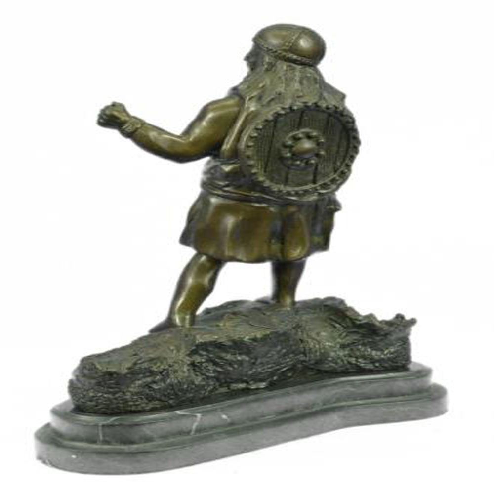 A simply dressed Viking warrior, a Freemen, dressed more modestly unable to afford the heavy army that comes with greater wealth. He is a warrior no less, able to use is fighting savvy, brute strength, and sword to overcome his opponents in battle. This warrior holds his fist in a fit of triumph and rage as he shouts out. His sword is held firmly in his other hand and his handbuilt wooden shield slung across his back. This Bronze Sculpture was crafted using the lost wax method and stands on a marble base. Bronze Dimensions with Marble Base: Height 13 X Width 9 inches. Weight: 13 LBS.