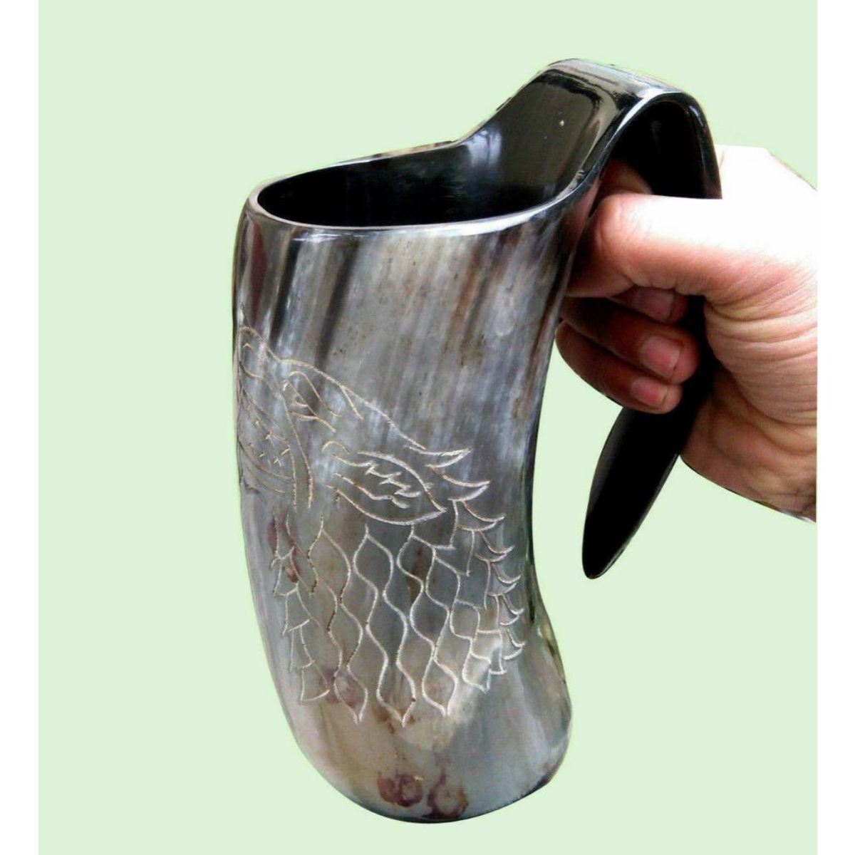 Real black ox horn, Ukraine origin, carved into a drinking mug. Game of Thrones, Viking-style handled mug, with decorative carving depicting a fanged wolf. Approx 6" H.