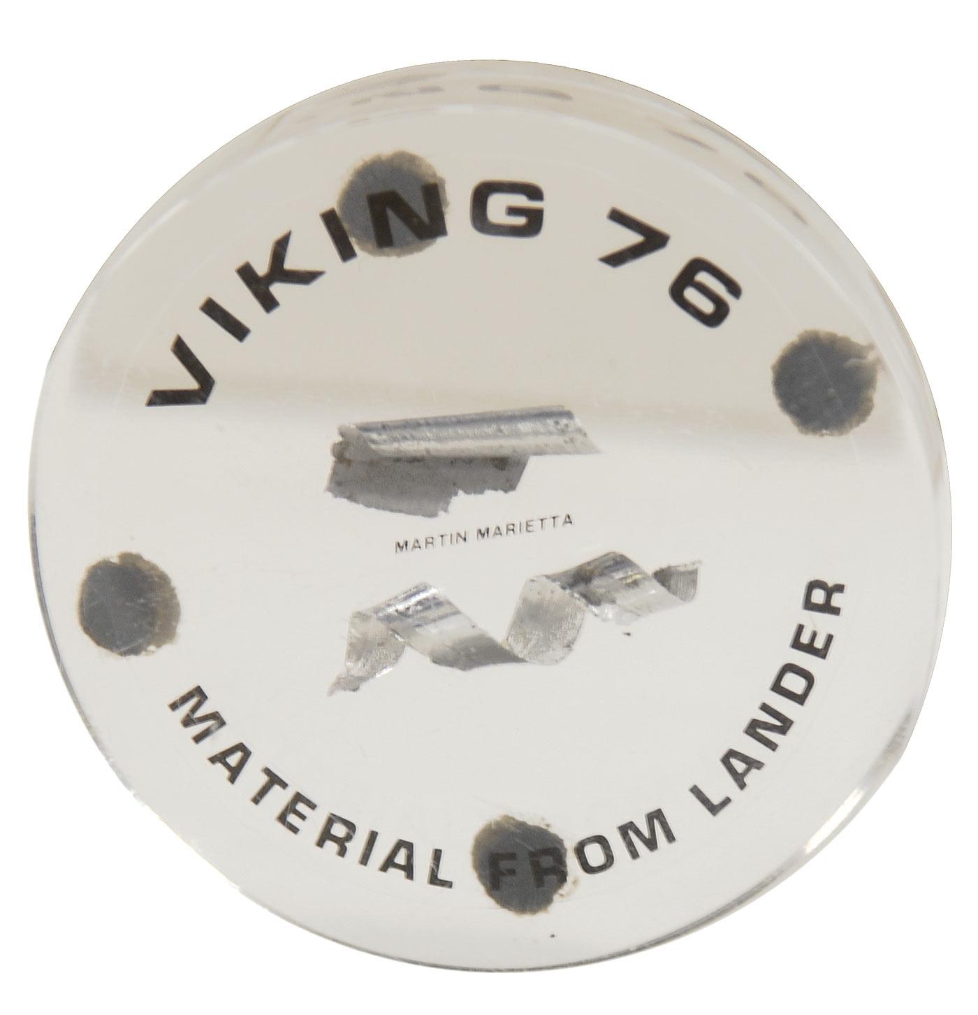 Two small pieces of material drilled from the 1976 Viking space probe that landed on Mars. Each silver-colored piece measures about 1” long and was milled from the spacecraft. Carefully floating in a 2.5”-diameter and 1” tall clear plastic disc imprinted, “VIKING 76 Material From Lander.” A unique reminder of mankind’s mission to our nearest planetary neighbor.