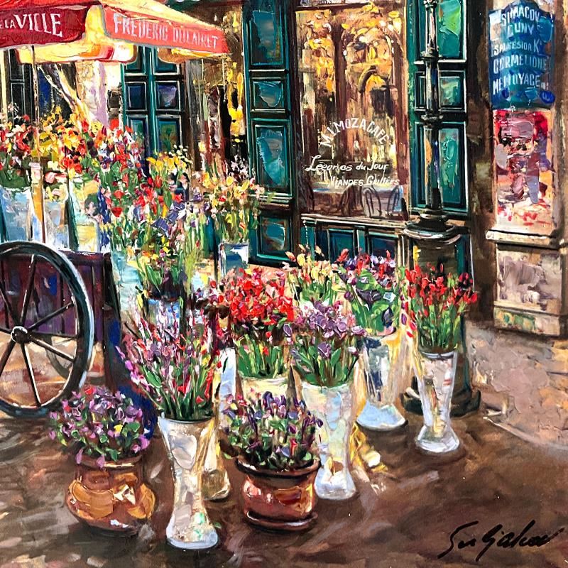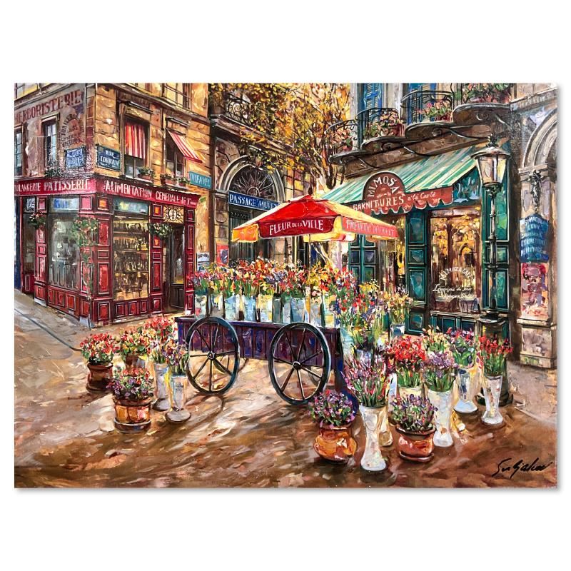 "Cafe Mimosa" is a hand embellished limited edition printer's proof on stretched canvas by Vadik Suljakov, numbered inverso 1/5 and hand signed by the artist. Includes Letter of Authenticity. Measures approx. 18" x 24" (image). There may be minor wear on the corners and edges.