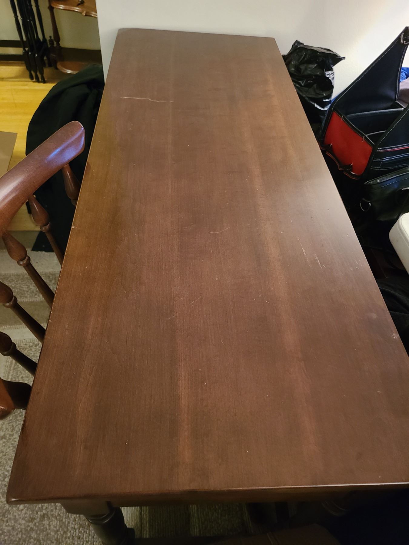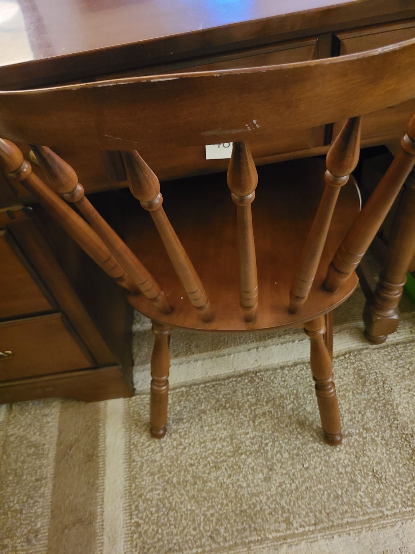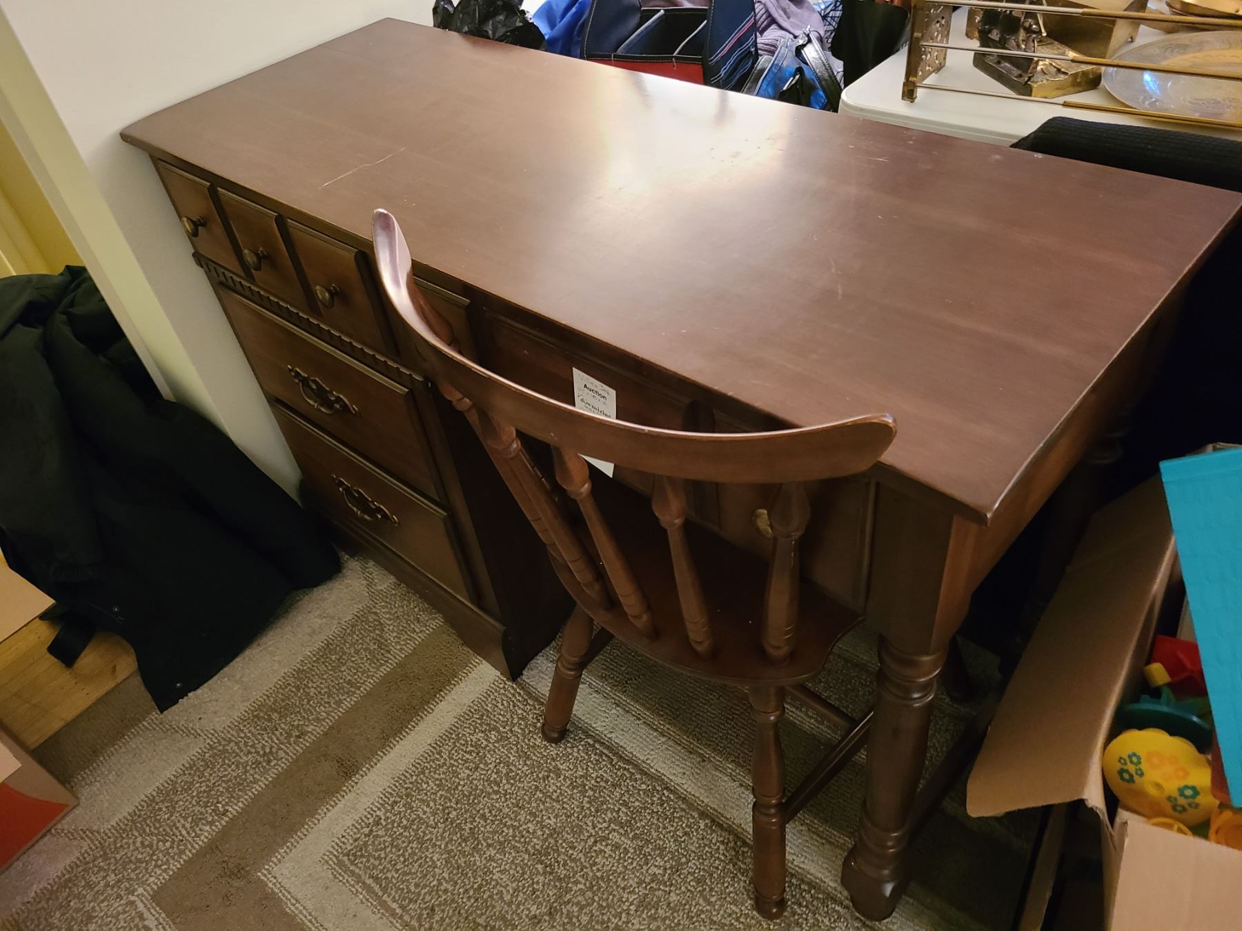 Vilas Maple desk, 48x18x31, with wooden chair 17x15x33. Please note scratches. Bring help to move. Pickup in cat. C at 11 am.
