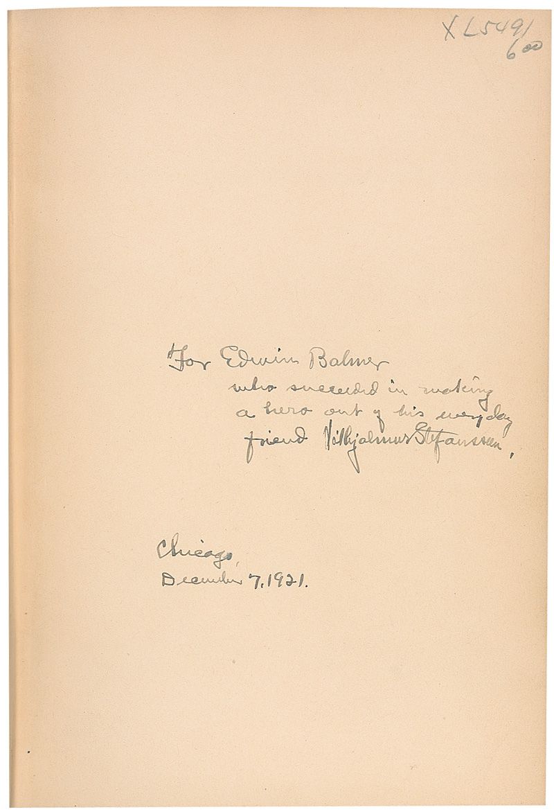 Canadian explorer and ethnologist (1879–1962) best known for his expeditions to the Arctic and for his studies of the native peoples there. Signed book: The Friendly Arctic. First edition. NY: The McMillan Company, 1921. Hardcover, 6.25 x 9, 784 pages. Signed and inscribed on the first free end page, “For Edwin Balmer, who succeeded in making a hero out of his everyday friend Vilhjalmur Stefansson, Chicago, December 7, 1921.” Mild toning to signed page, pencil notation to top of signed page, loose, but intact front hinge, and scattered wear to covers and spine, otherwise very good condition. The two fold-out maps are included.