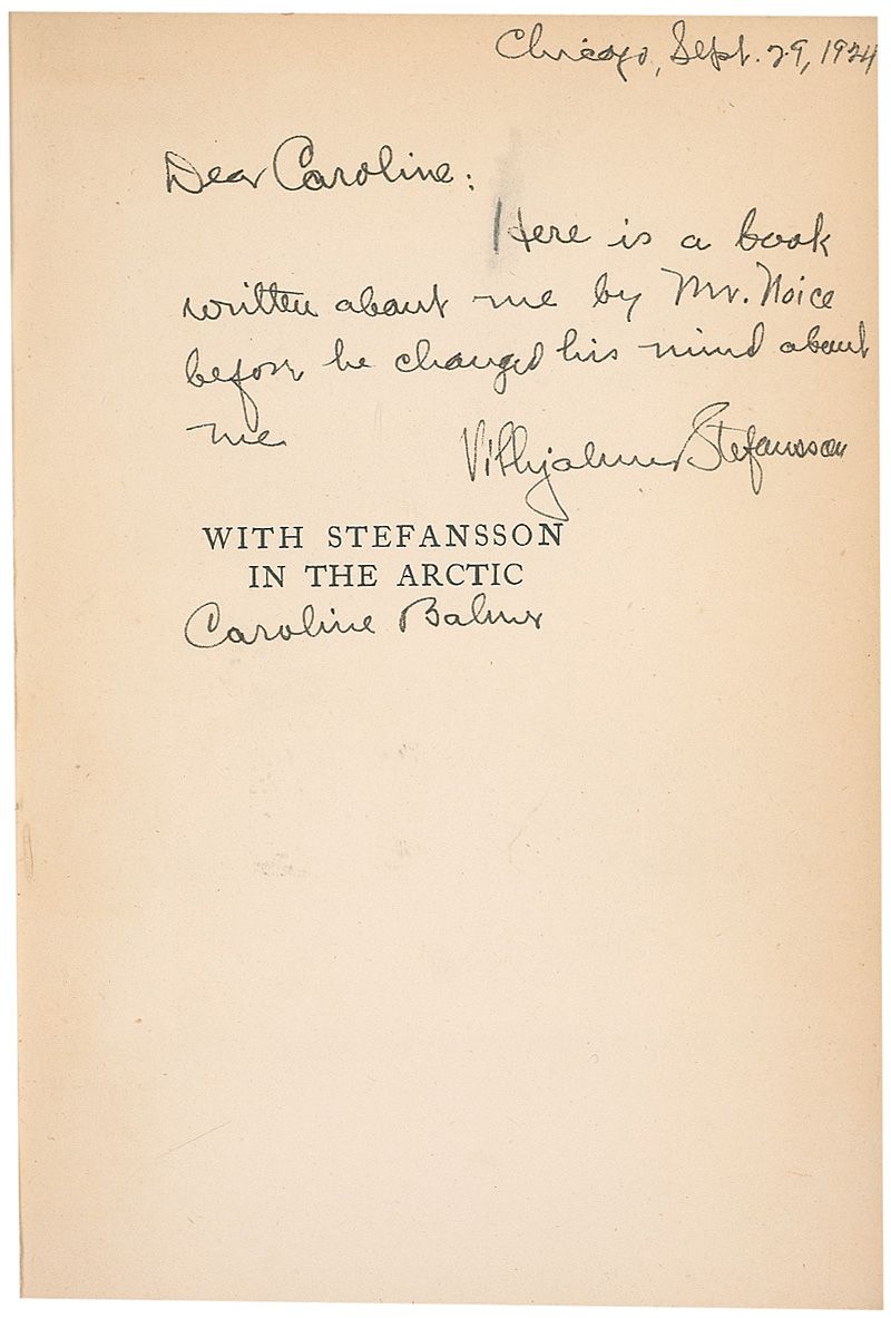 Signed book: With Stefansson in the Arctic. First edition. NY: Dodd, Mead and Company. Hardcover, 6.25 x 9, 270 pages. Signed and inscribed on the half-title page “Chicago, Sept. 29, 1924, Dear Caroline, Here is a book written about me by Mr. Noice before he changed his mind about me. Vilhjalmur Stefansson.” In very good condition, with toning to signed page as well as opening and closing pages and both pastedowns, a slight brush to beginning of inscription, partially split front hinge, and scattered light wear to covers.