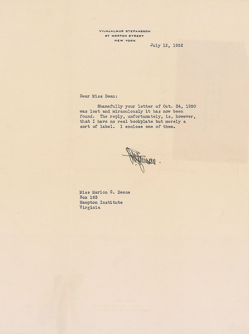 Canadian explorer and ethnologist (1879–1962) best known for his expeditions to the Arctic and for his studies of the native peoples there. TLS signed “V. Stefansson,” one page, 8.25 x 11, personal letterhead, July 12, 1932. Letter to a collector. In part: “Shamefully your letter…was lost and miraculously it has now been found. The reply, unfortunately, is, however, that I have no real bookplate but merely a sort of label. I enclose one of them.” In fine condition, with intersecting folds and the aforementioned label affixed to the reverse of letter.