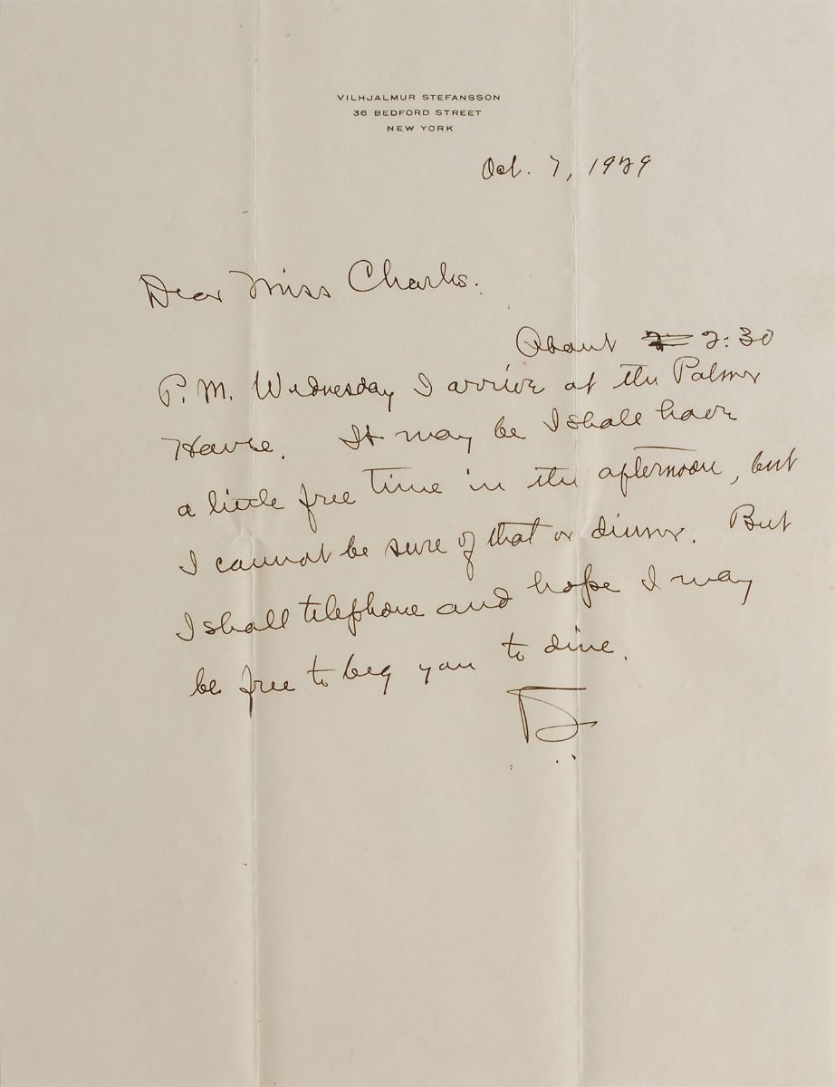 Canadian explorer and ethnologist (1879–1962) best known for his expeditions to the Arctic and for his studies of the native peoples there. Two ALSs, one signed in full and one signed with an initial, each one page, October 1929. The first, in part: “About 2:30 P.M. Wednesday I arrive at the Palmer Hotel. It may be I shall have a little free time in the afternoon, but I cannot be sure of that.” The second, in part: “To continue our talk at dinner this evening I am asking my publisher to send you a copy of The Standardization of Error.” In overall fine condition. Accompanied by both original mailing envelopes addressed in Stefansson’s hand.