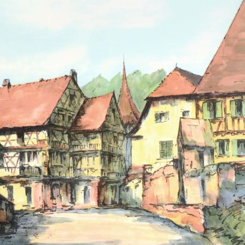 "Village Kaisbeberg" is a limited edition lithograph on paper by Laurant, numbered and hand signed by the artist. Measures approx. 29.5" x 21.5" (border), 24" x 18.5" (image).