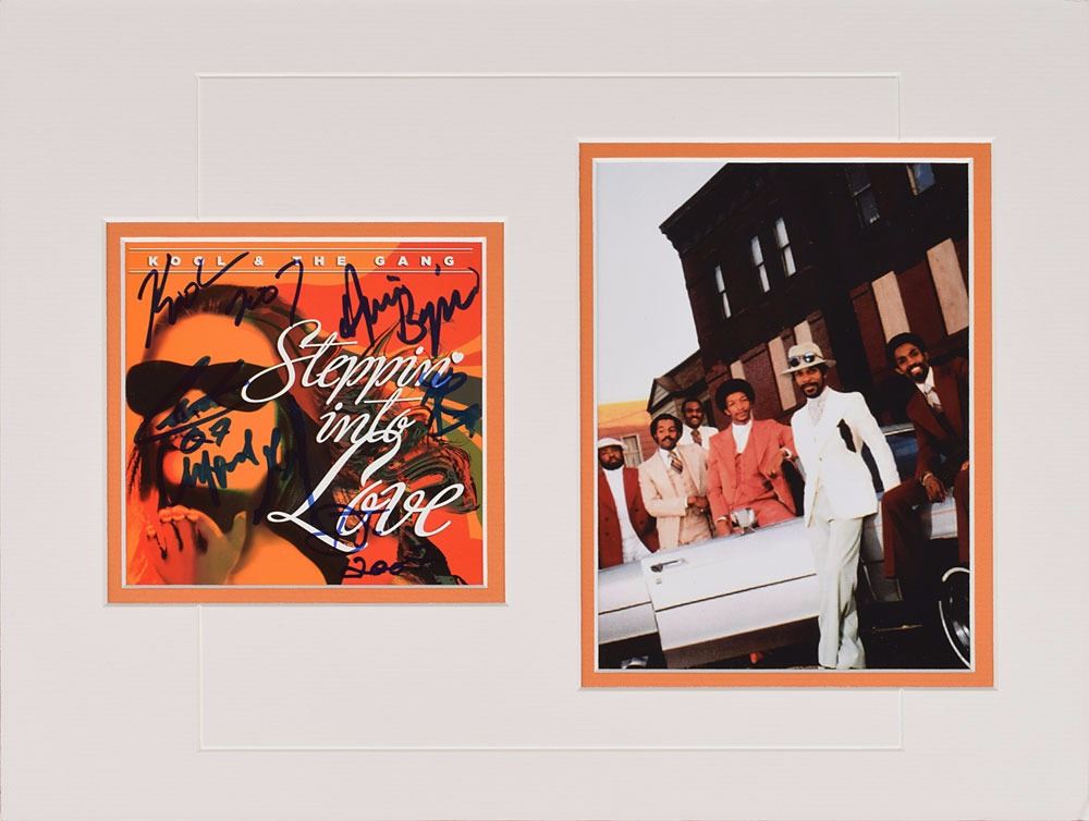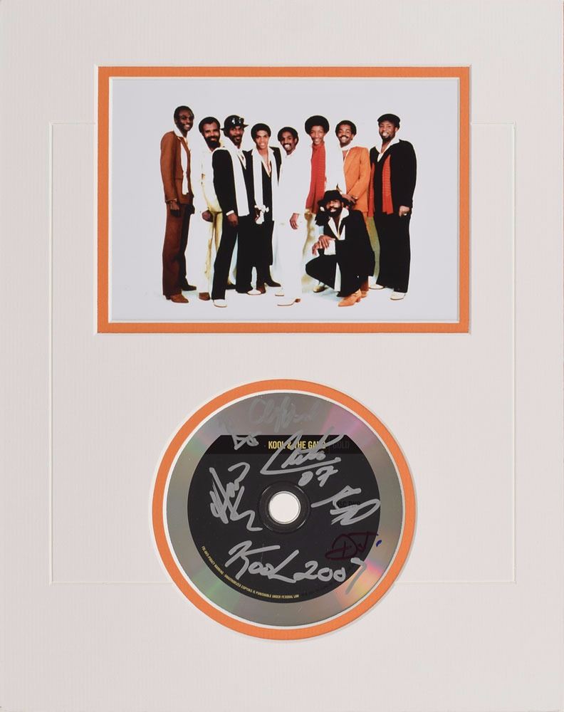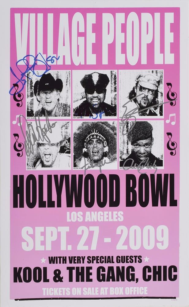 Three items: a color satin-finish 11 x 17 photo of a poster promoting a Village People concert at Los Angeles' Hollywood Bowl on September 27, 2009, signed in silver ink or blue felt tip by Felipe Rose, Alex Briley, Ray Simpson, Eric Anzalone, Jeff Olson, and David Hodo; a CD booklet for Stepping into Love by Kool & the Gang, signed in blue felt tip by Robert 'Kool' Bell, George Brown, Dennis Thomas, Clifford Adams, Curtis Williams, Amir Bayyan, and Michael Ray, double-matted with a photo to an overall size of 14 x 11; and a compact disc for Gold by Kool & the Gang, signed in silver ink and blue felt tip by the aforementioned seven members, double-matted with a photo to an overall size of 11 x 14. In overall fine condition.