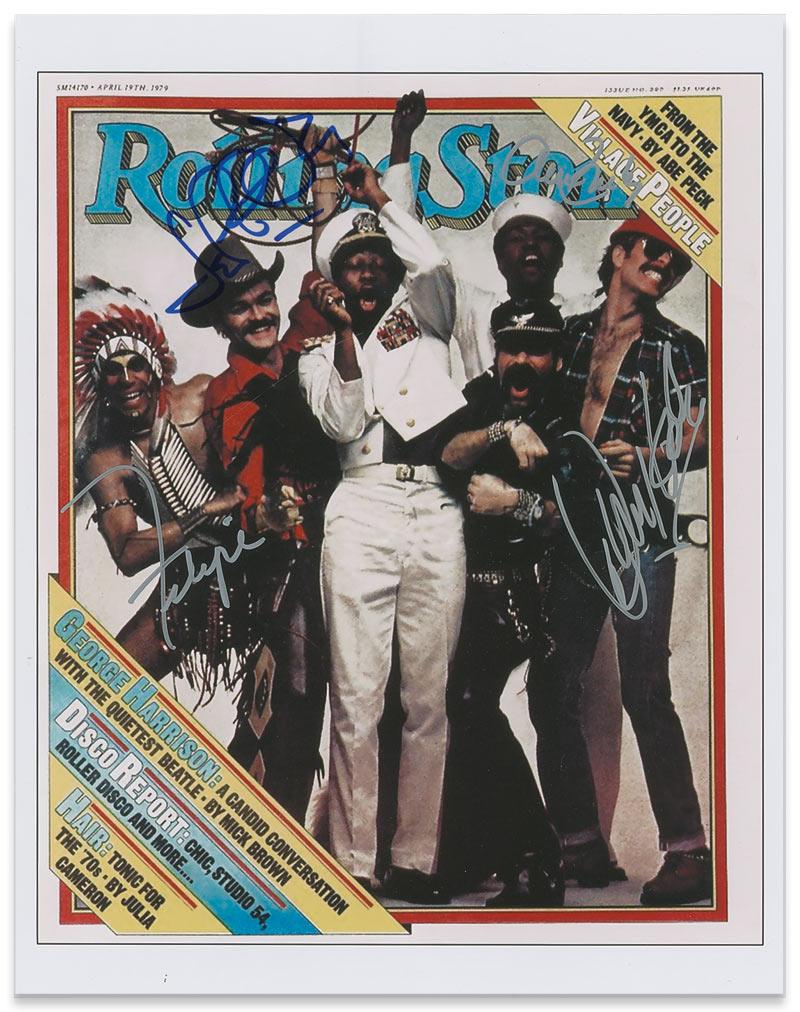 Color satin-finish 11 x 14 photo of the April 19, 1979, issue of Rolling Stone, signed in ink and felt tip by Felipe Rose, Alex Briley, David Hodo, and Jeff Olson. In fine condition, with light contrast to Briley’s signature.