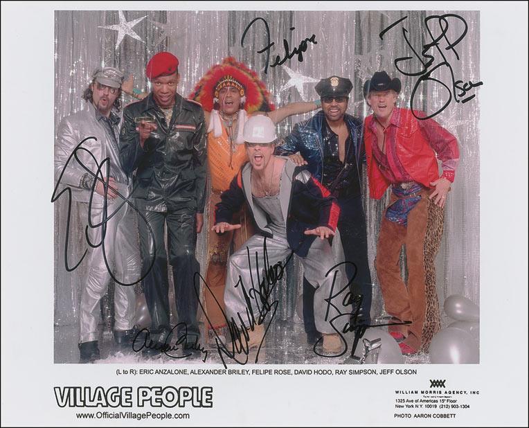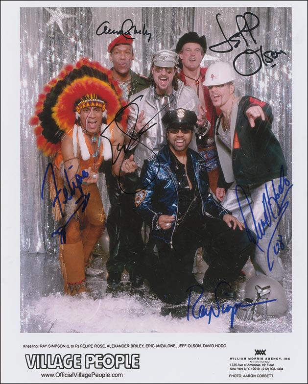 Two color glossy publicity photos, a 10 x 8, signed in black felt tip by Ray Simpson, David Hodo, Jeff Olson, Eric Anzalone, Alex Briley, and Felipe [Rose]; and an 8 x 10 signed in blue and black felt tip also signed by all six. In fine condition.