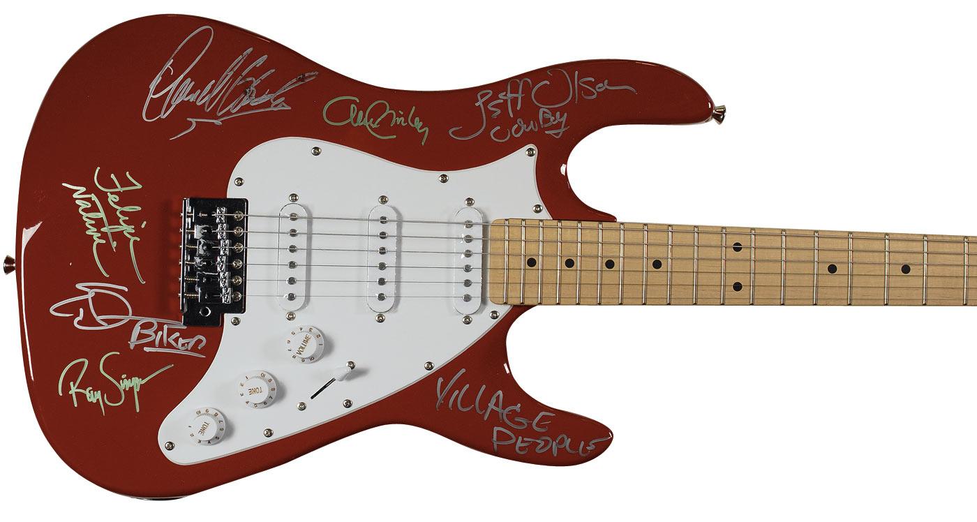 Red-bodied California ‘stratocaster-style’ electric guitar, signed on the body in green and silver ink by Felipe Rose, Alex Briley, David Hodo, Jeff Olson, Ray Simpson, and Eric Anzalone, with one member adding the band’s name to the body. In fine condition. Oversized.