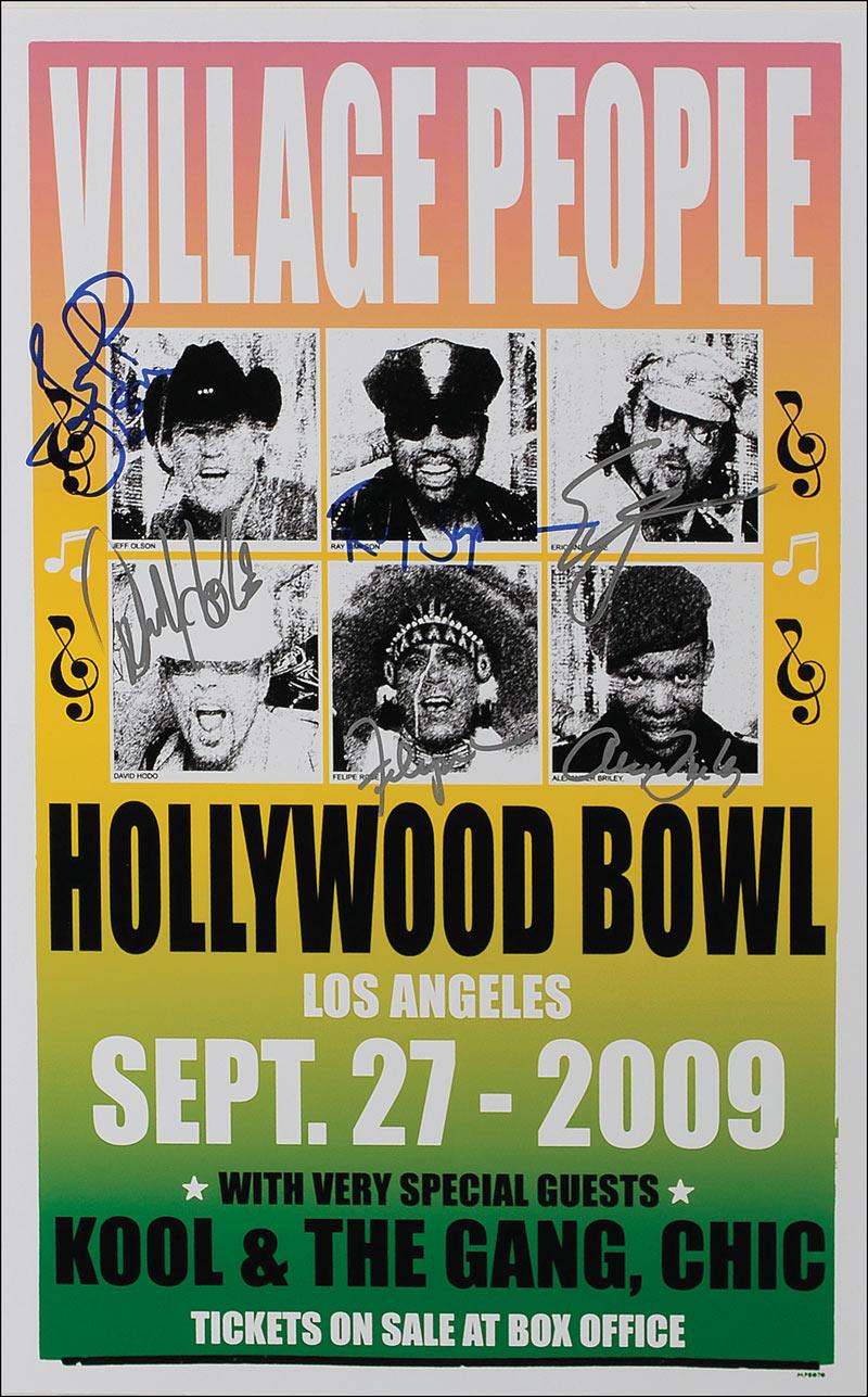 Color satin-finish 11 x 17 photo of a poster for a Village People concert at the Hollywood Bowl in 2009, signed in blue felt tip and silver ink by Felipe [Rose], Alex Briley, David Hodo, Jeff Olson, Ray Simpson, and Eric Anzalone. In very fine condition.