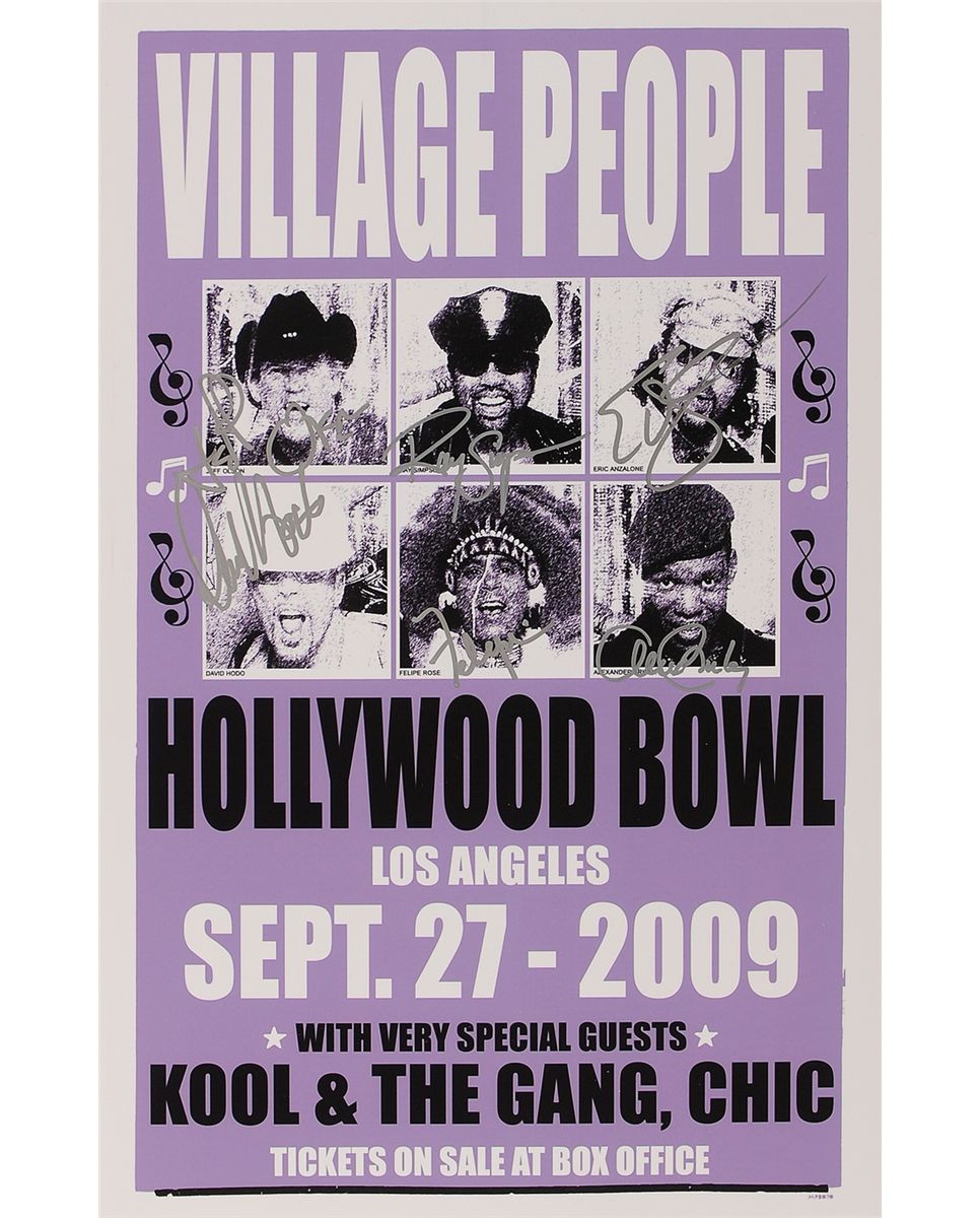 Color satin-finish 11 x 17 photo of a poster for a Village People concert at the Hollywood Bowl in 2009, signed in silver ink by Felipe [Rose], Alex Briley, David Hodo, Jeff Olson, Ray Simpson, Eric Anzalone. In very fine condition.