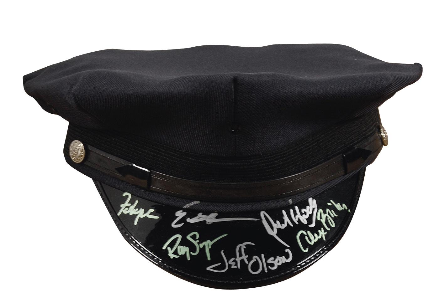 Police cap signed in green or silver ink by six members of the Village People. Signers are: Felipe [Rose], Alex Briley, David Hodo, Jeff Olson, Ray Simpson, and Eric Anzalone. In very fine condition.