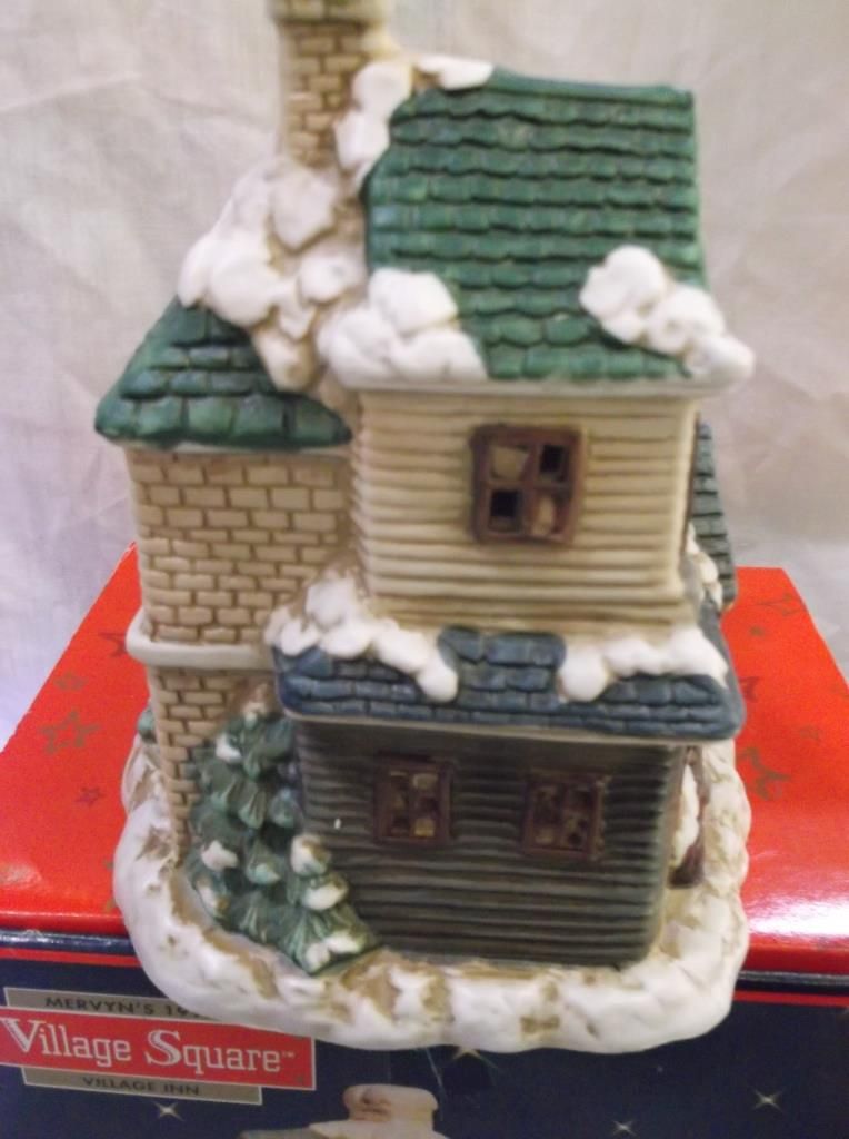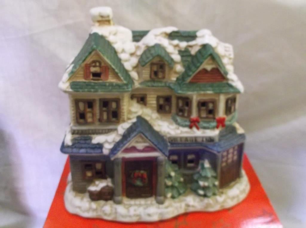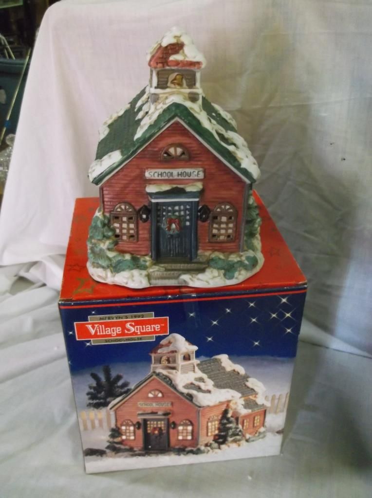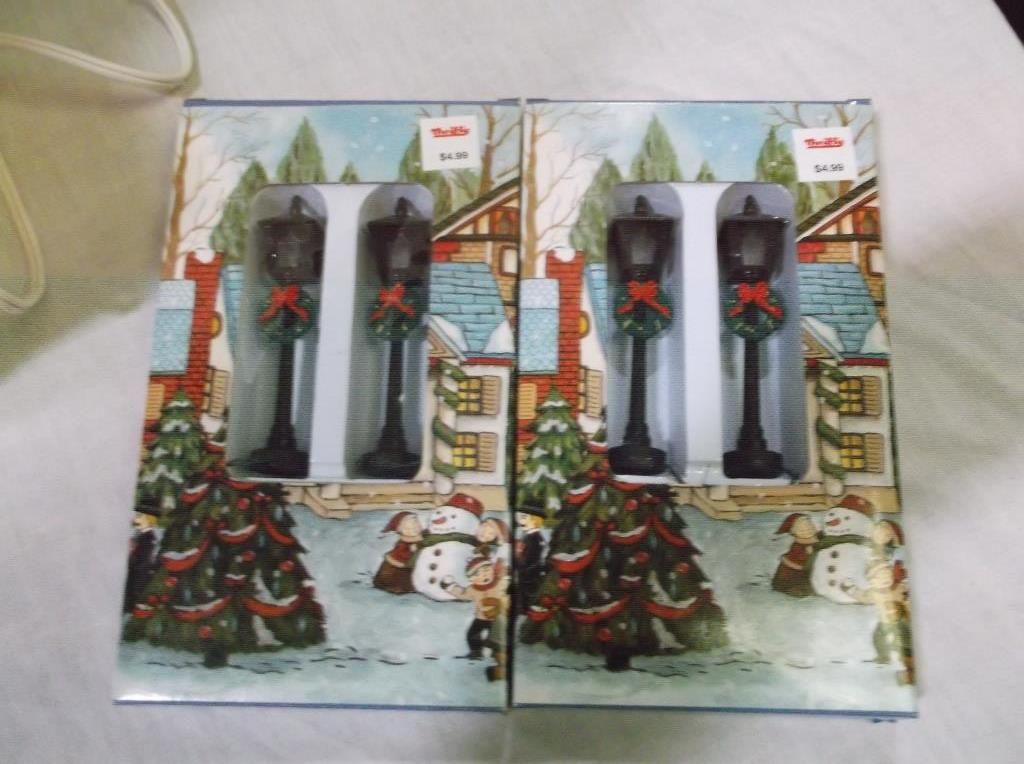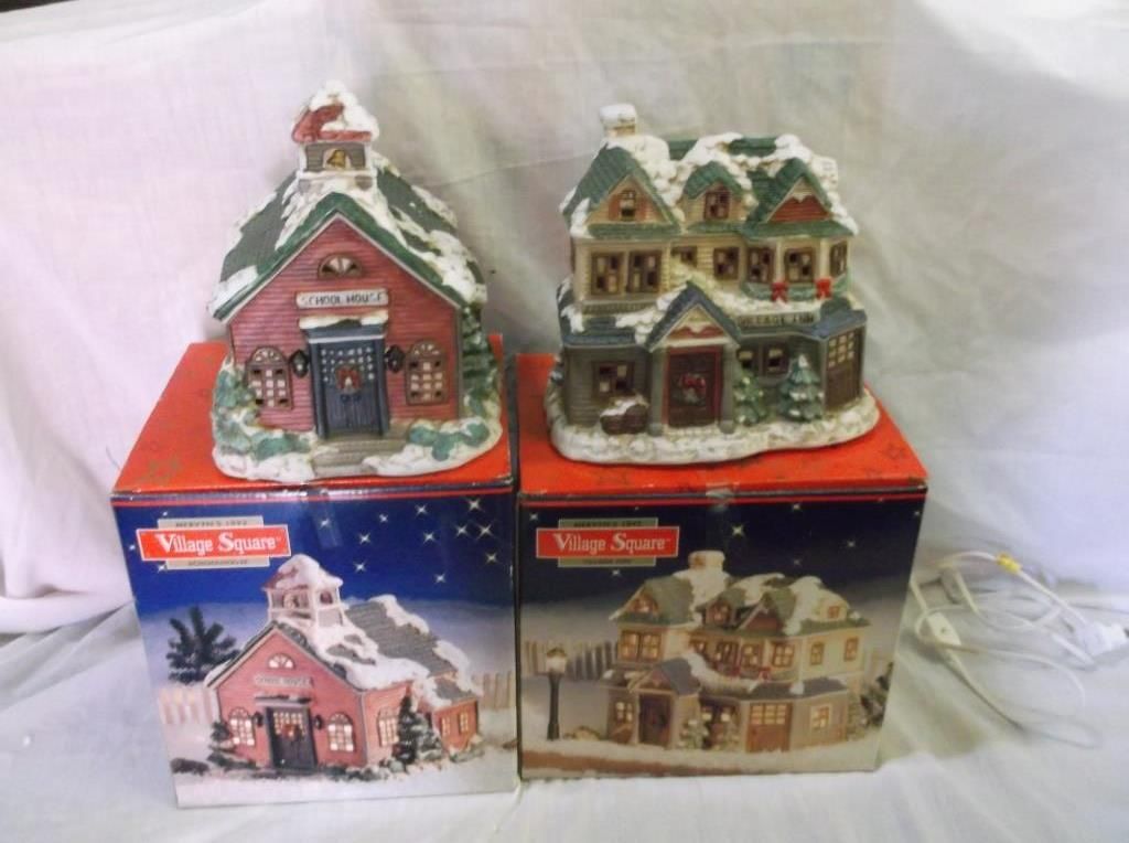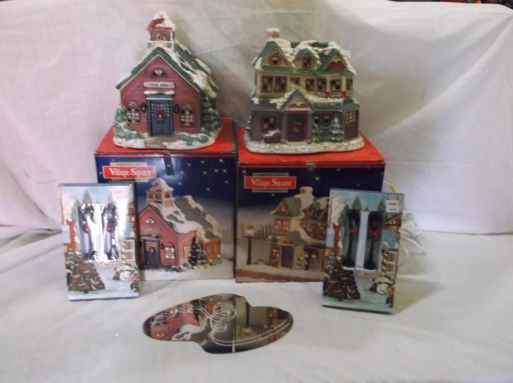 1-School House lighted no cord approx 7" x 9.5" & 1- Village Inn with cord approx 9" x 9" with a pair of Street Lanterns (2 each box) & ice pond........