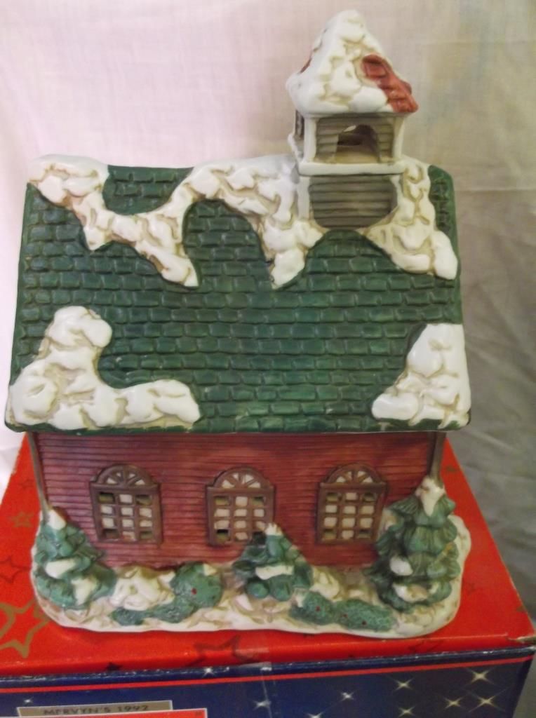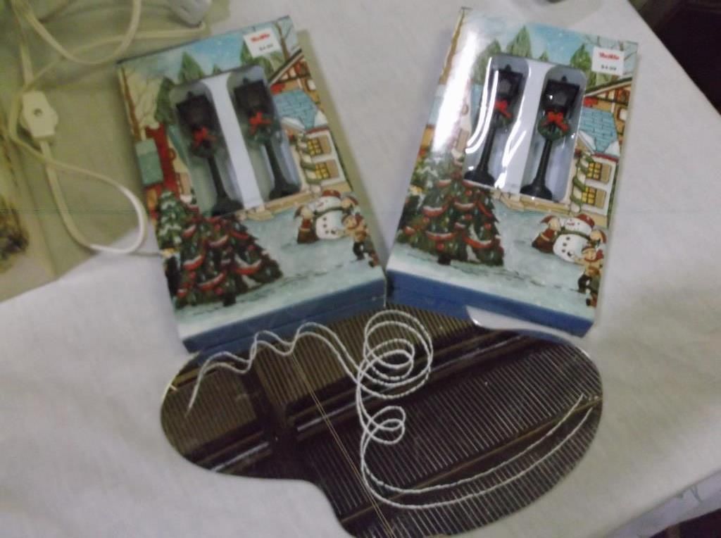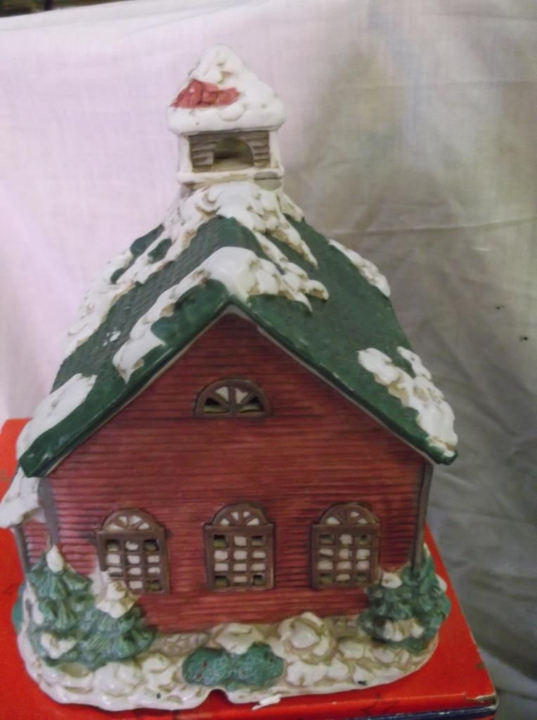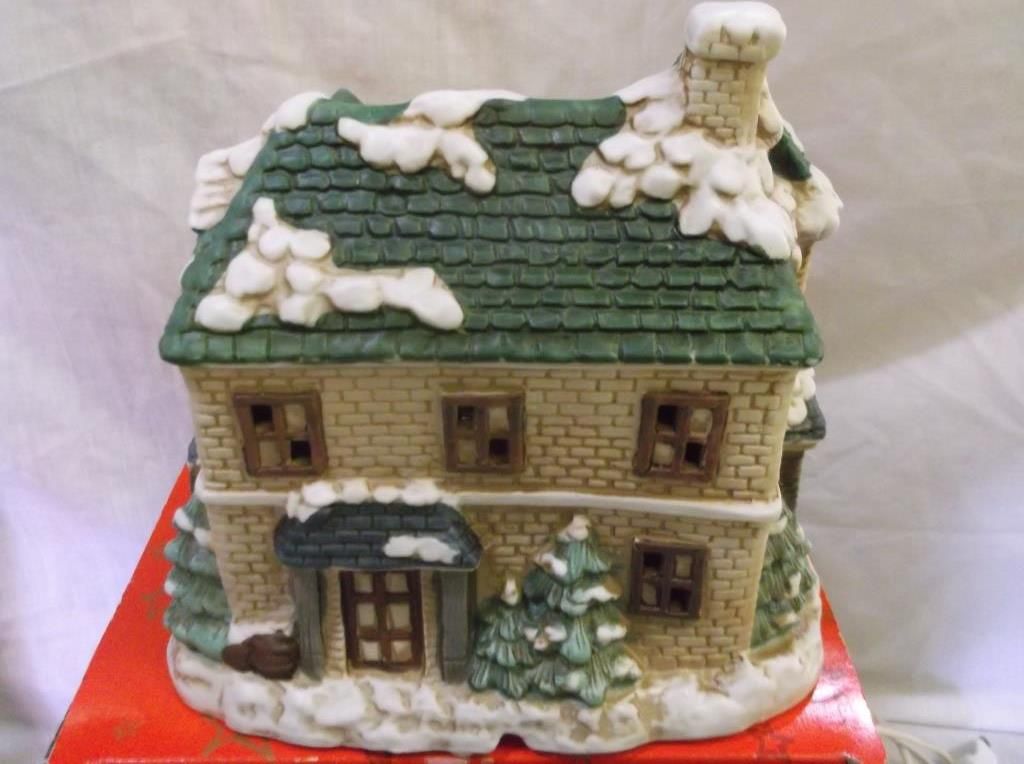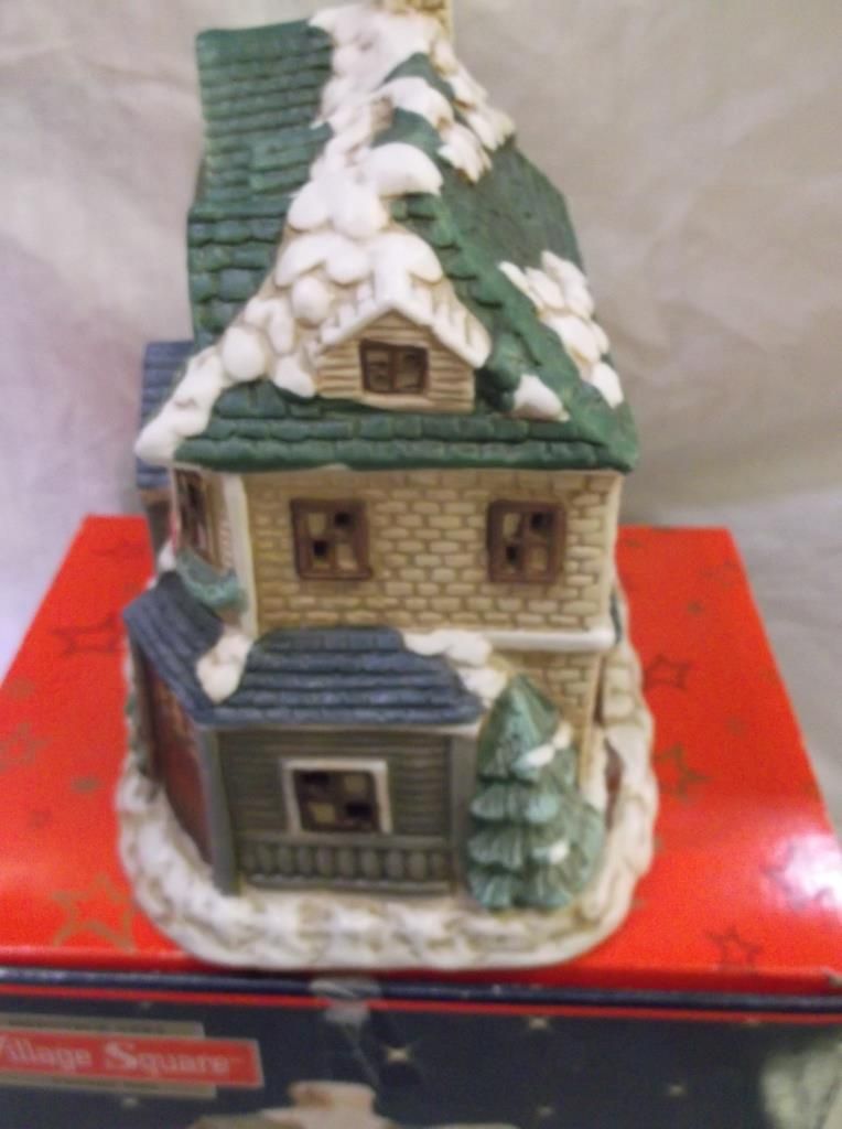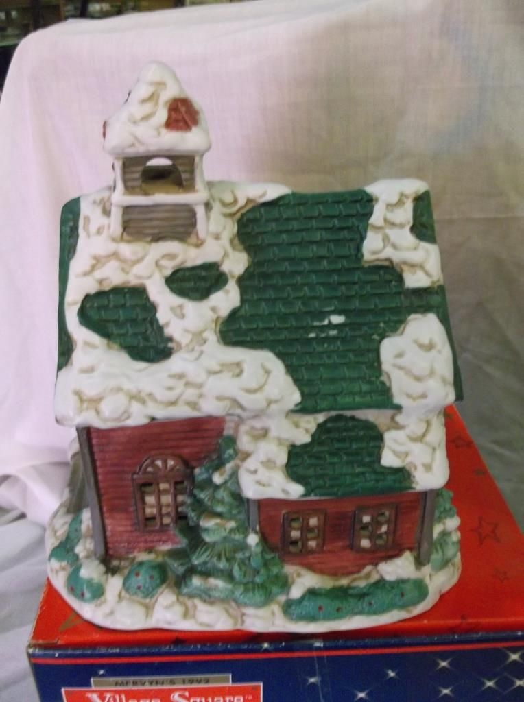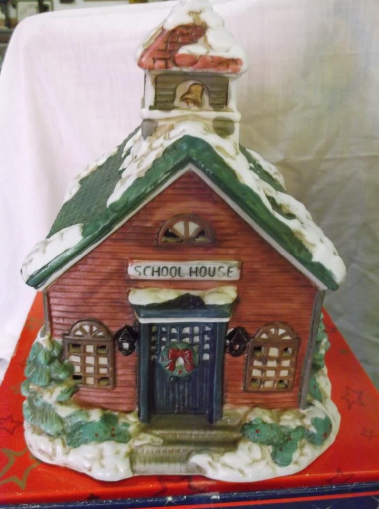 1-School House lighted no cord approx 7" x 9.5" & 1- Village Inn with cord approx 9" x 9" with a pair of Street Lanterns (2 each box) & ice pond........
