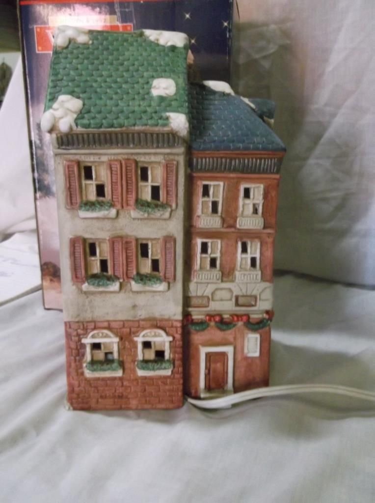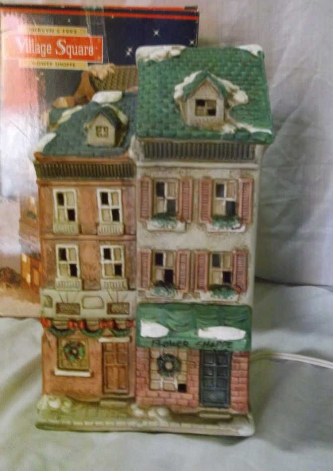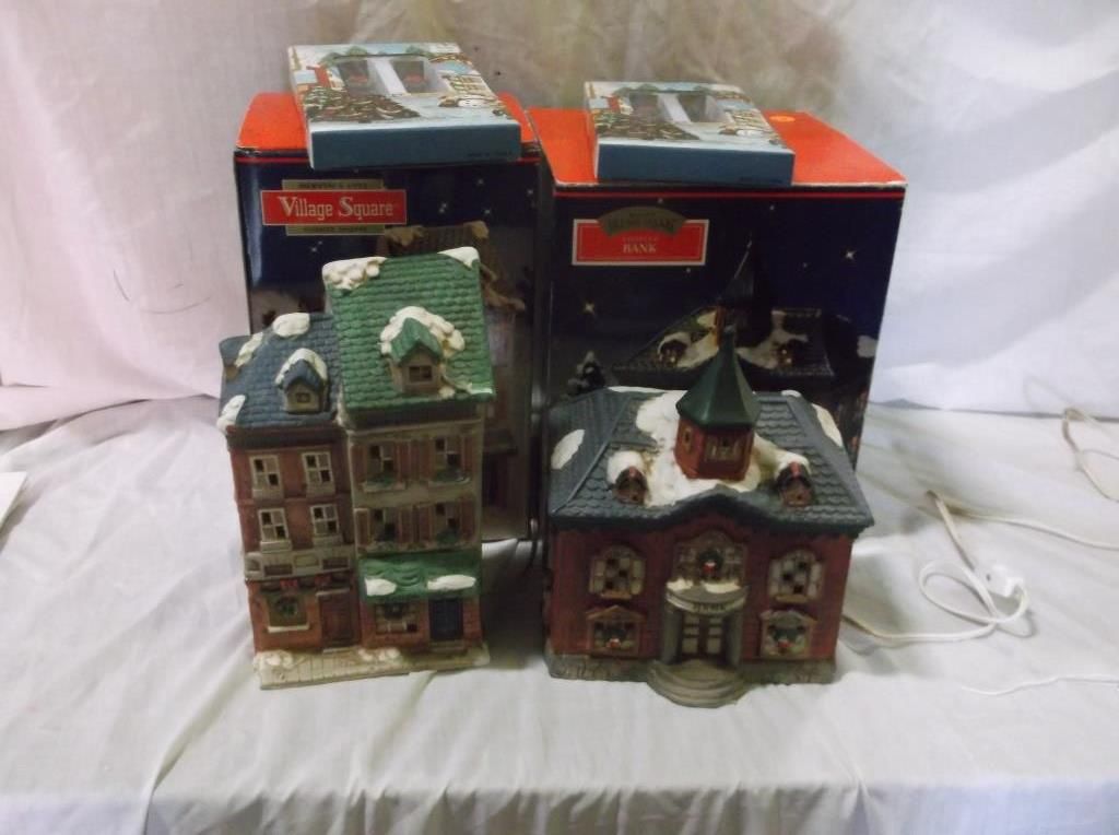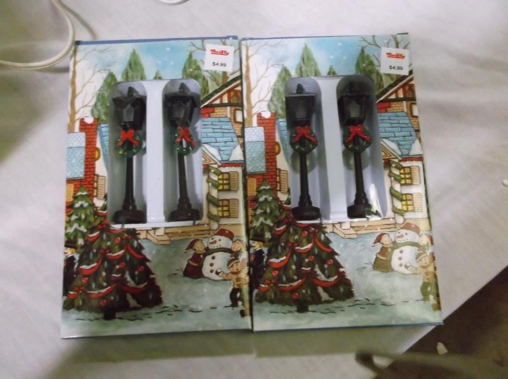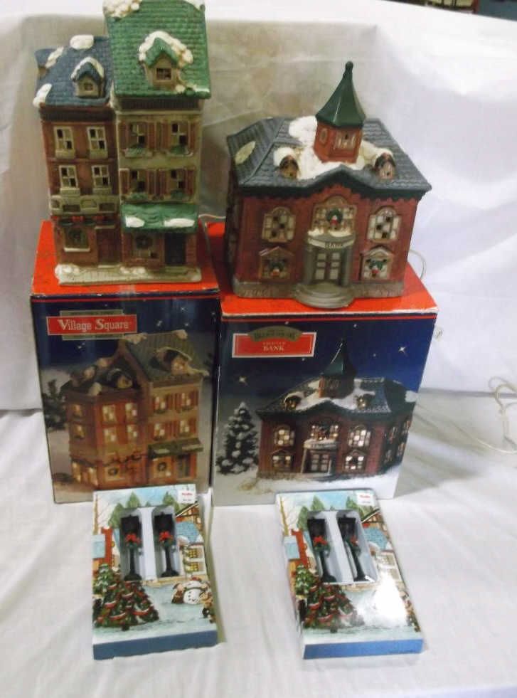 1- lighted bank approx 7" x 9.5" in box 1-lighted flower shop approx 6" x 11" pair of street lanterns new in box 2 in each box