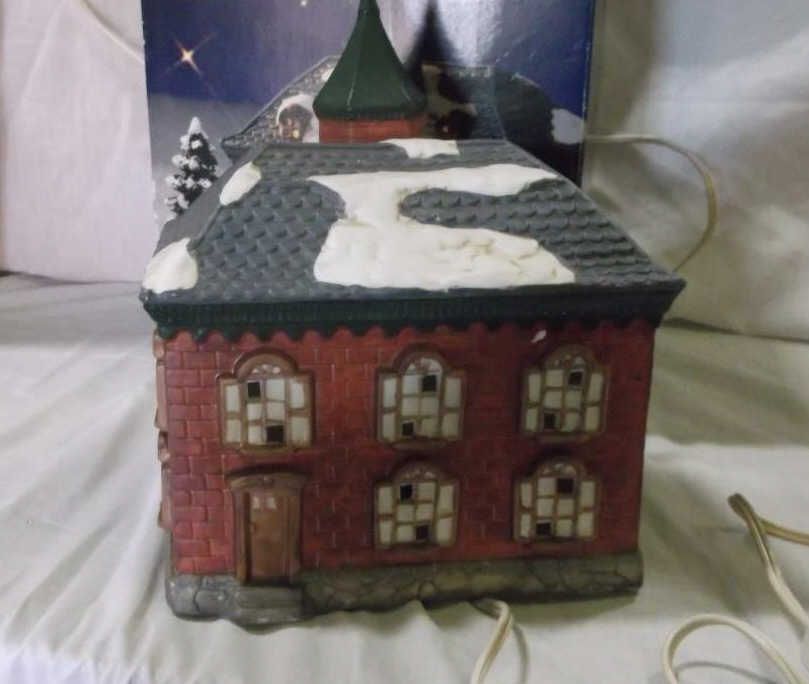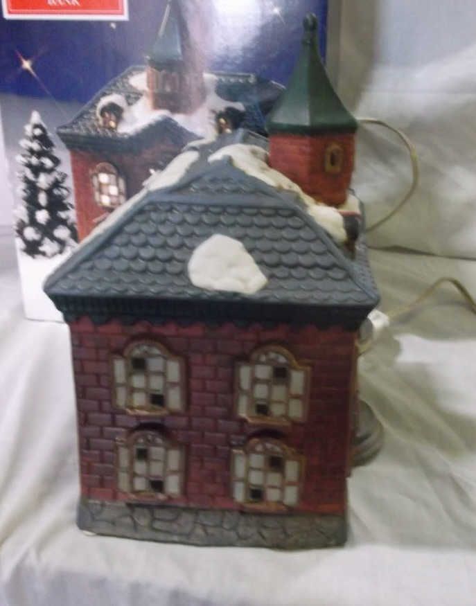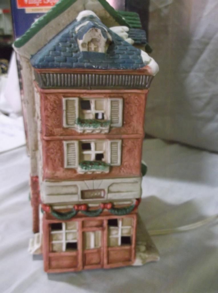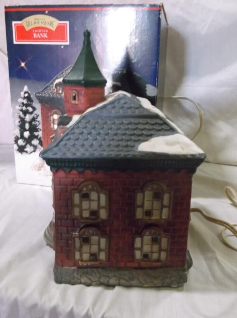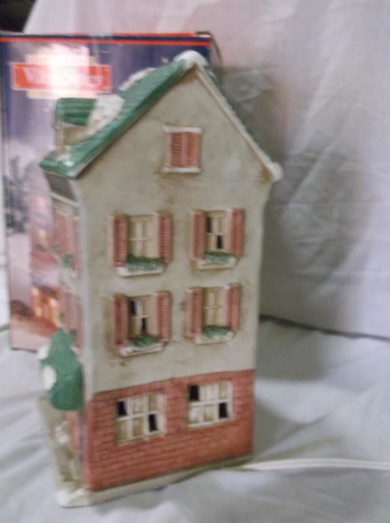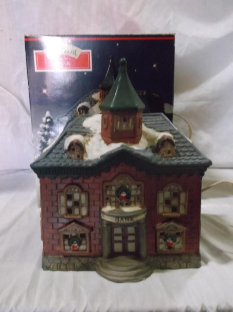1- lighted bank approx 7" x 9.5" in box 1-lighted flower shop approx 6" x 11" pair of street lanterns new in box 2 in each box