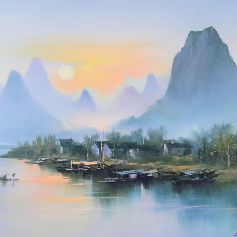 "Village at Dusk" is a hand embellished limited edition giclee on stretched canvas by H. Leung, numbered and hand signed by the artist. Includes Letter of Authenticity. Measures approx. 45" x 27" (image).