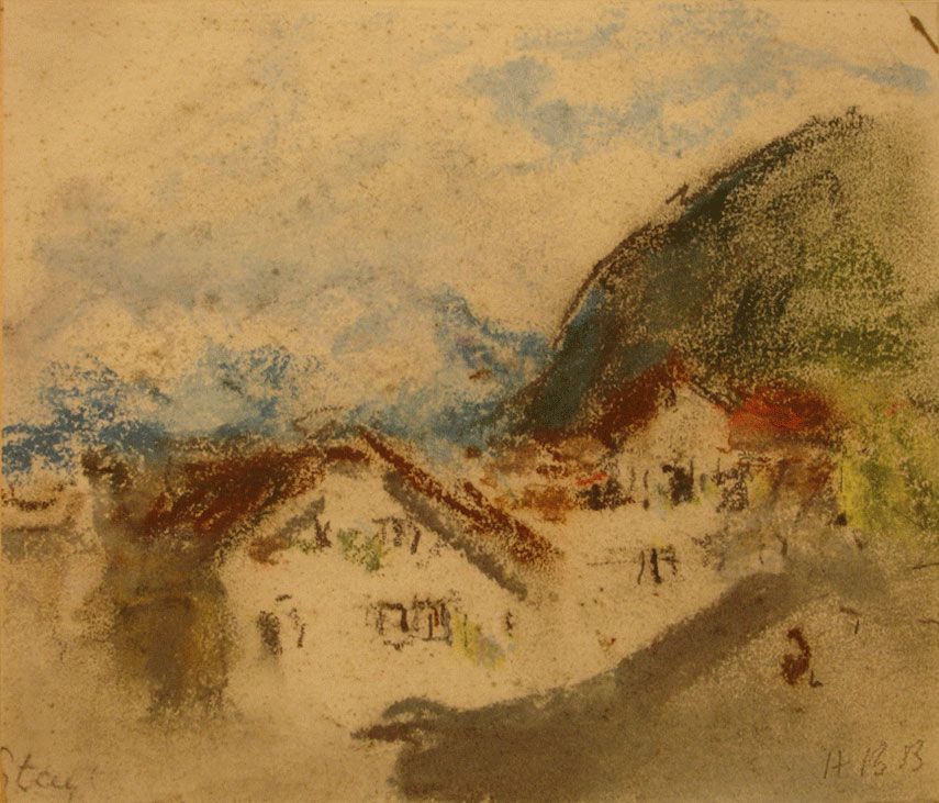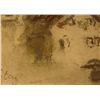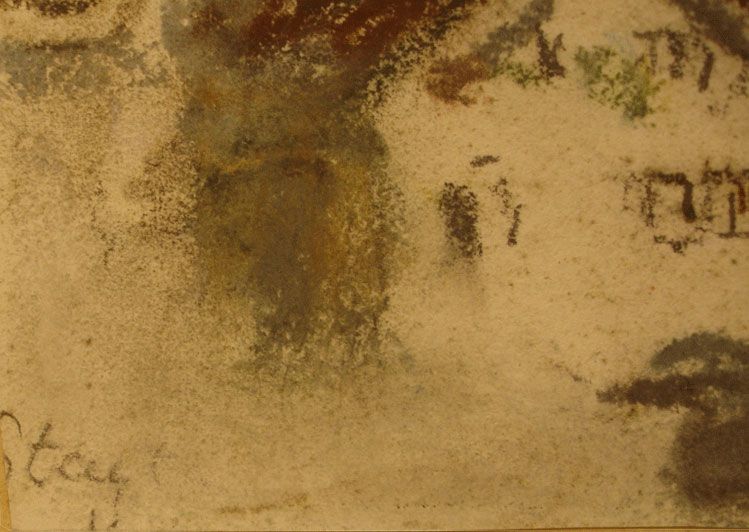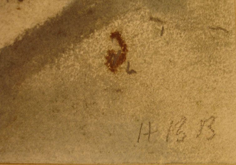Signed initials in pencil L/R. Image is in good condition. Glued to an old board w/marks. Taped on matt board frame.