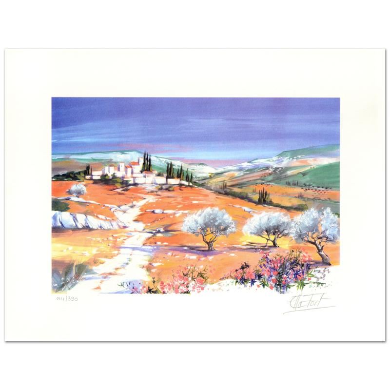 "Village in the Clearing" is a limited edition lithograph on paper by Ella Fort, numbered and hand signed by the artist! Measures approx. 16" x 12" (with border), 12" x 9" (image).