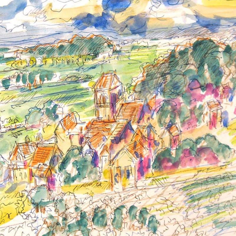"Village of Volnay, Burgundy" is an original Mixed Media on Paper by Wayne Ensrud. The piece is hand signed by the artist and comes with a Certificate of Authenticity. Measures approximately 13" x 16".