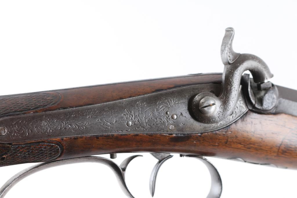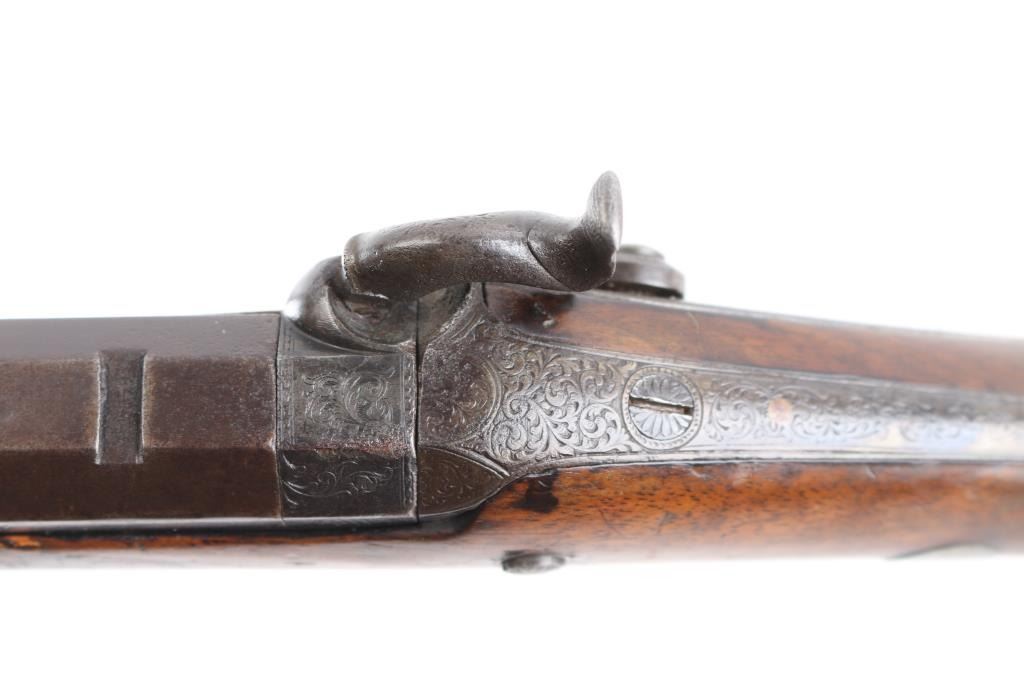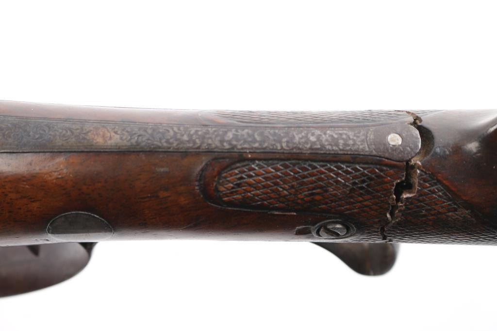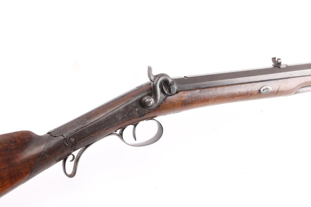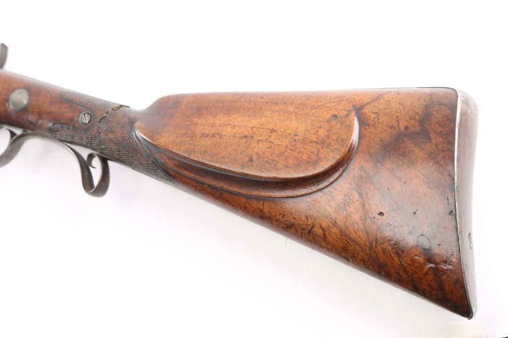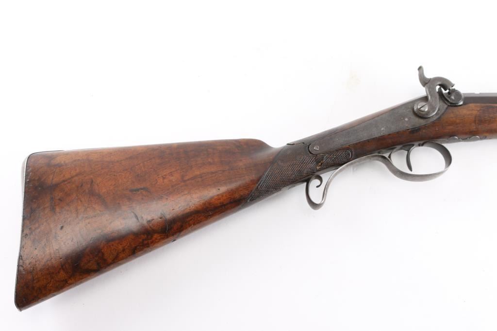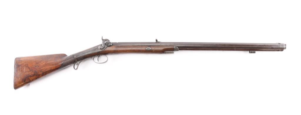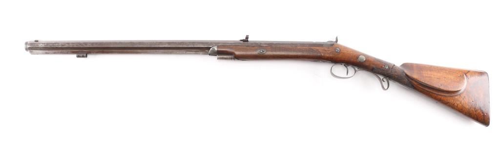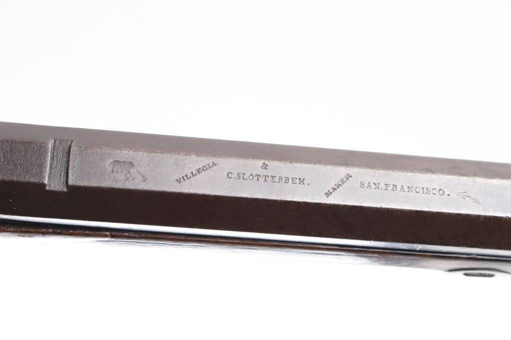 Late back action percussion locked plains rifle marked "VILLEGIA & C.SLOTTERBECK. MAKER SAN.FRANCISCO". with California bear at the rear of breech. Measured 42 1/2" overall, rifled barrel measures 27" with semi-false muzzle & underside marked ".41" & "R. Southgate". Single set trigger, iron scroll guard, half stocked, medium weight, buck-horn rear sight, blade front sight and empty dovetail cut at the rear for the original "V" type iron sight (not present). Lightly checkered w/ cheek piece and characteristic silver inlay and escutcheons. Slotterbeck about the best of California makers who moved to Los Angeles late in his life. He began his career in Philadelphia where he worked for Henry Derringer and was involved in patent infringement trials over derringers pocket pistols. Sound mechanics, excellent bore stock is broken at the wrist. No ramrod.Condition is NRA Fair due to stock**Antique Firearm**