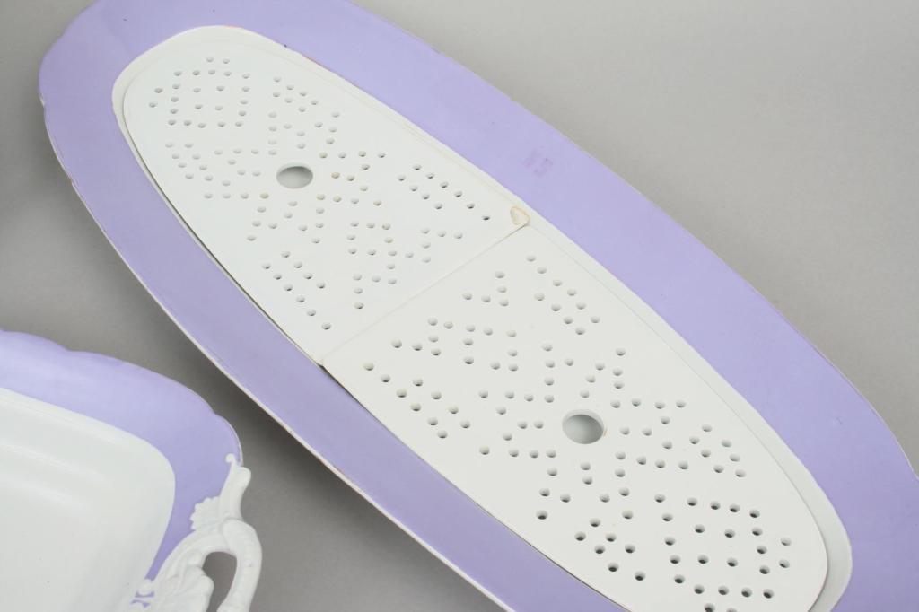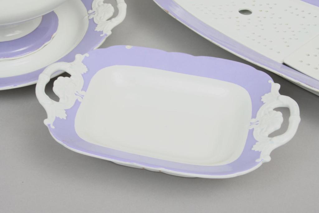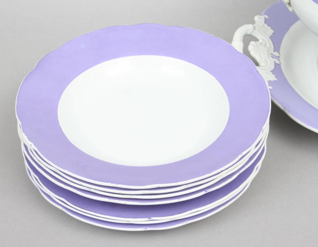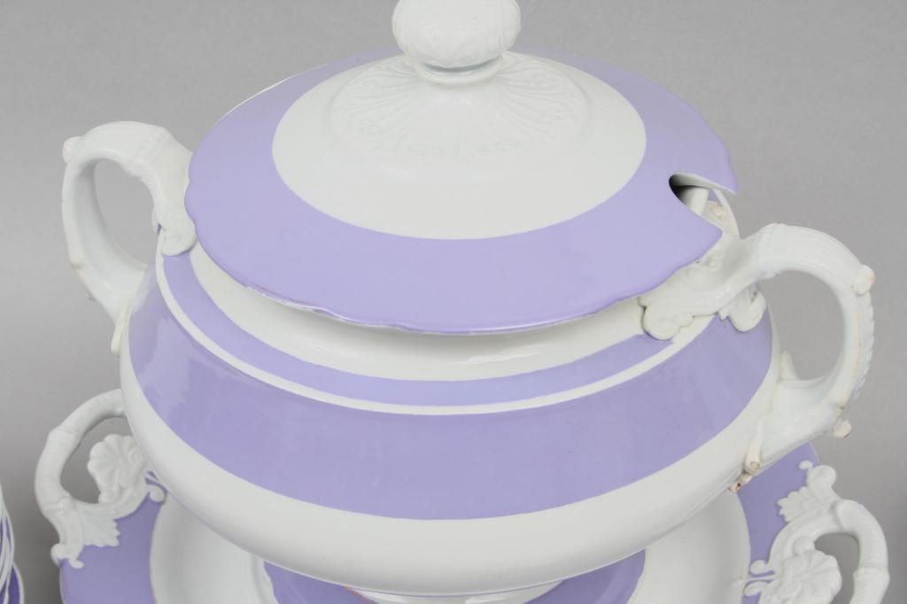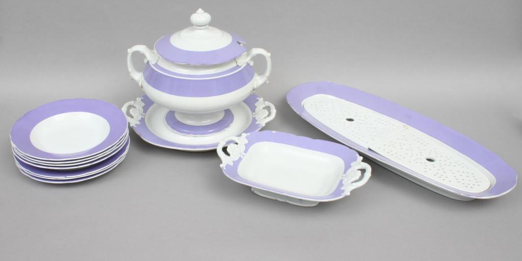 Villeroy and Boch, comprising; a fish platter with double strainer inserts, square serving bowl, tureen with lid and stand, three dinner plates, and three rim soup plates, each decorated with wide lavender band, stamped in blue Villeroy and Boch. Fish platter 22" x 8 3/4" (shallow flake to top of one insert). Square serving bowl in good condition. Plates and bowls with flakes and rim chips.